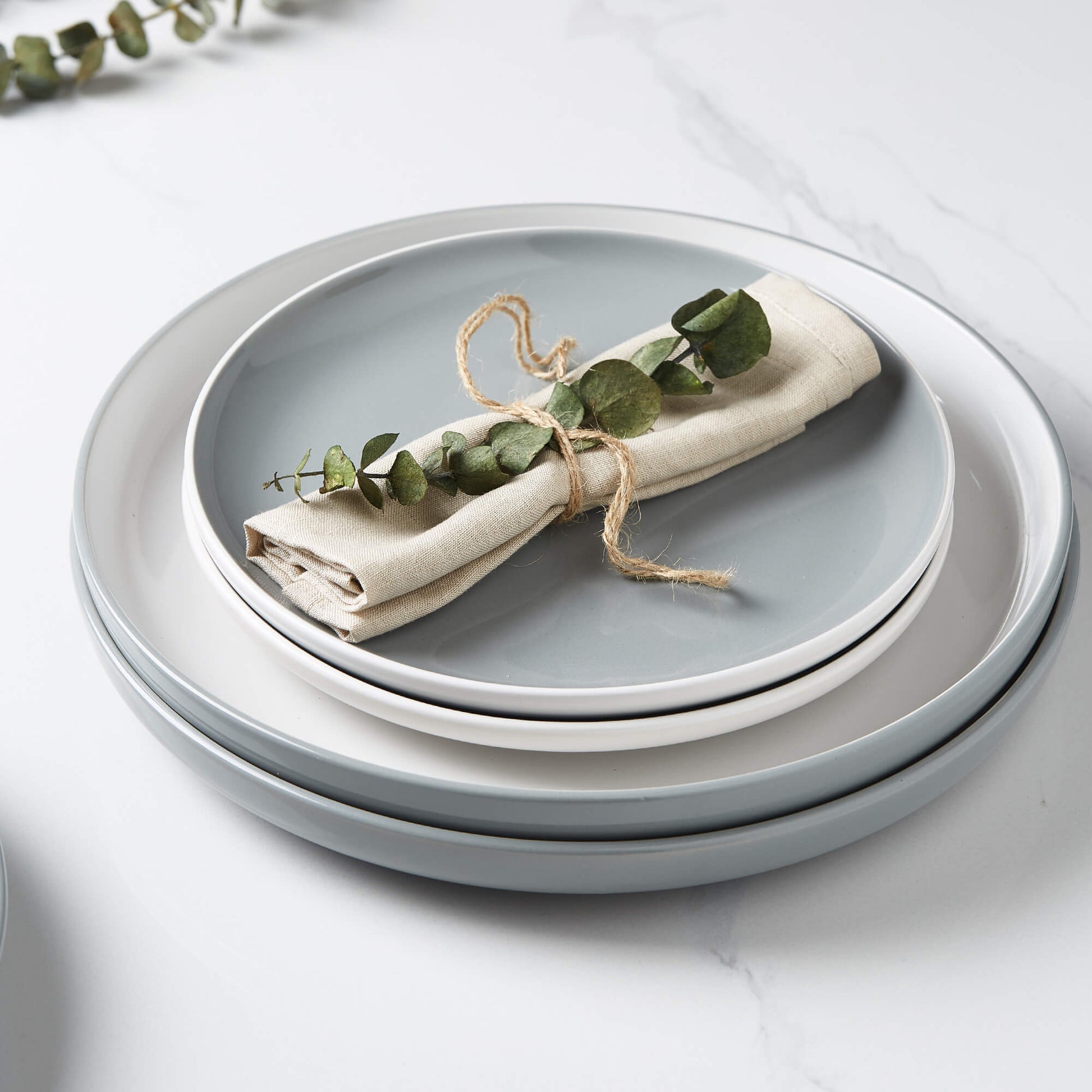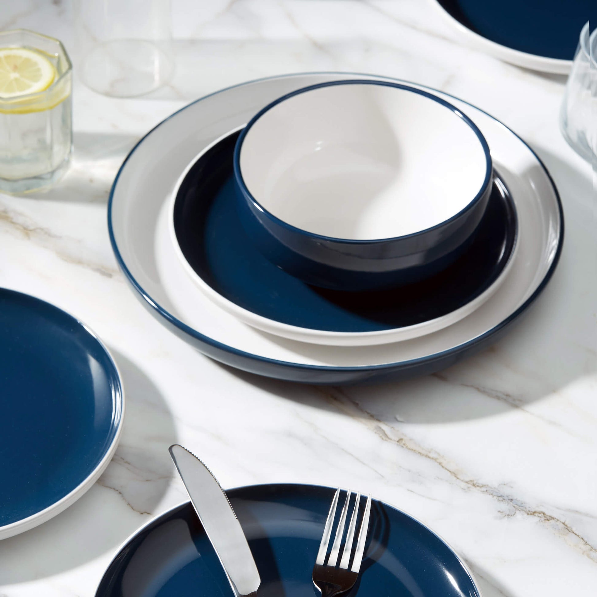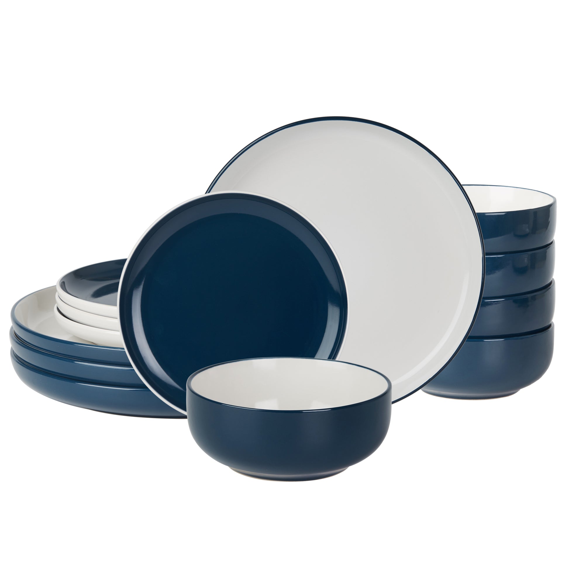 Dinnerware Sets(12pcs/16Pcs/18pcs), Bright Glaze Plates and Bowls Set, Large Rustic Shape Dinnerware Dish Set for Kitchen, Dishwasher & Microwave Safe, Gery With White, Blue With Wihte, Black with White