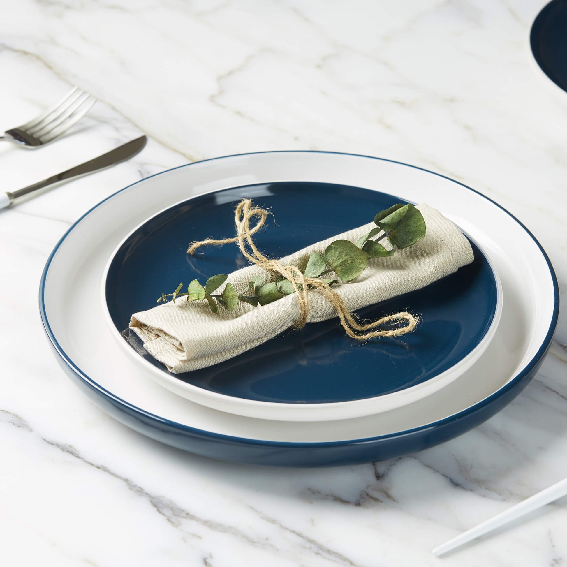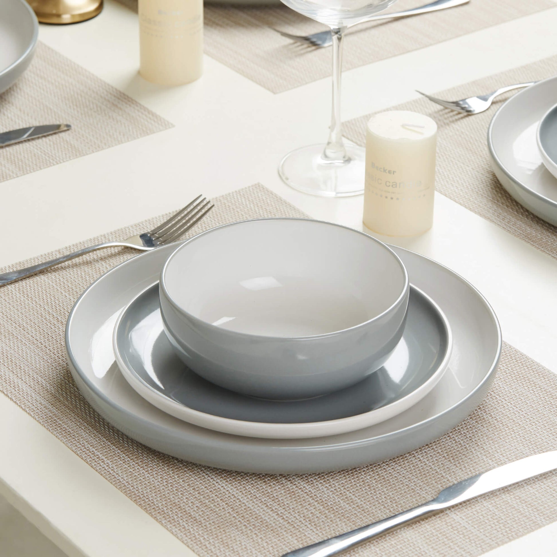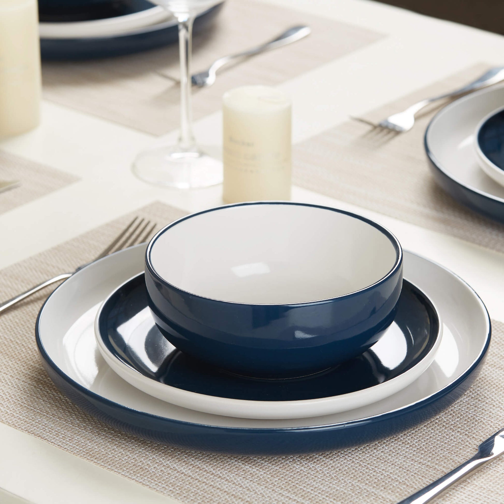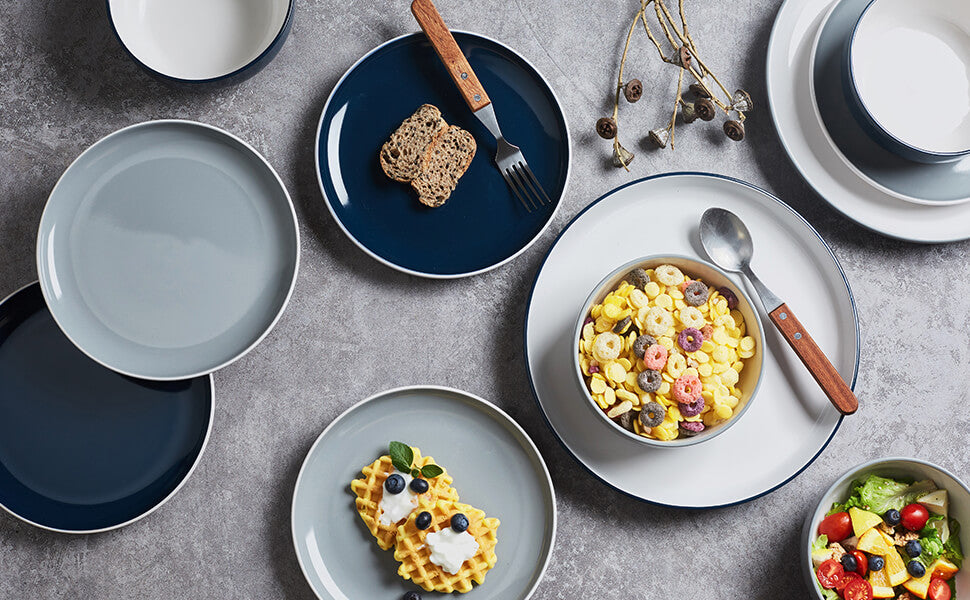 Dinnerware Sets(12pcs/16Pcs/18pcs), Bright Glaze Plates and Bowls Set, Large Rustic Shape Dinnerware Dish Set for Kitchen, Dishwasher & Microwave Safe, Gery With White, Blue With Wihte, Black with White