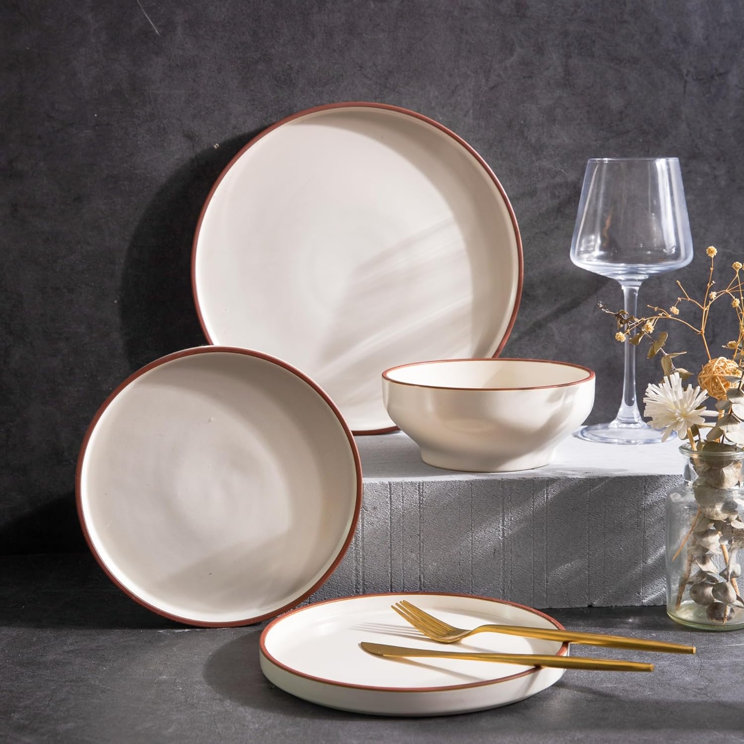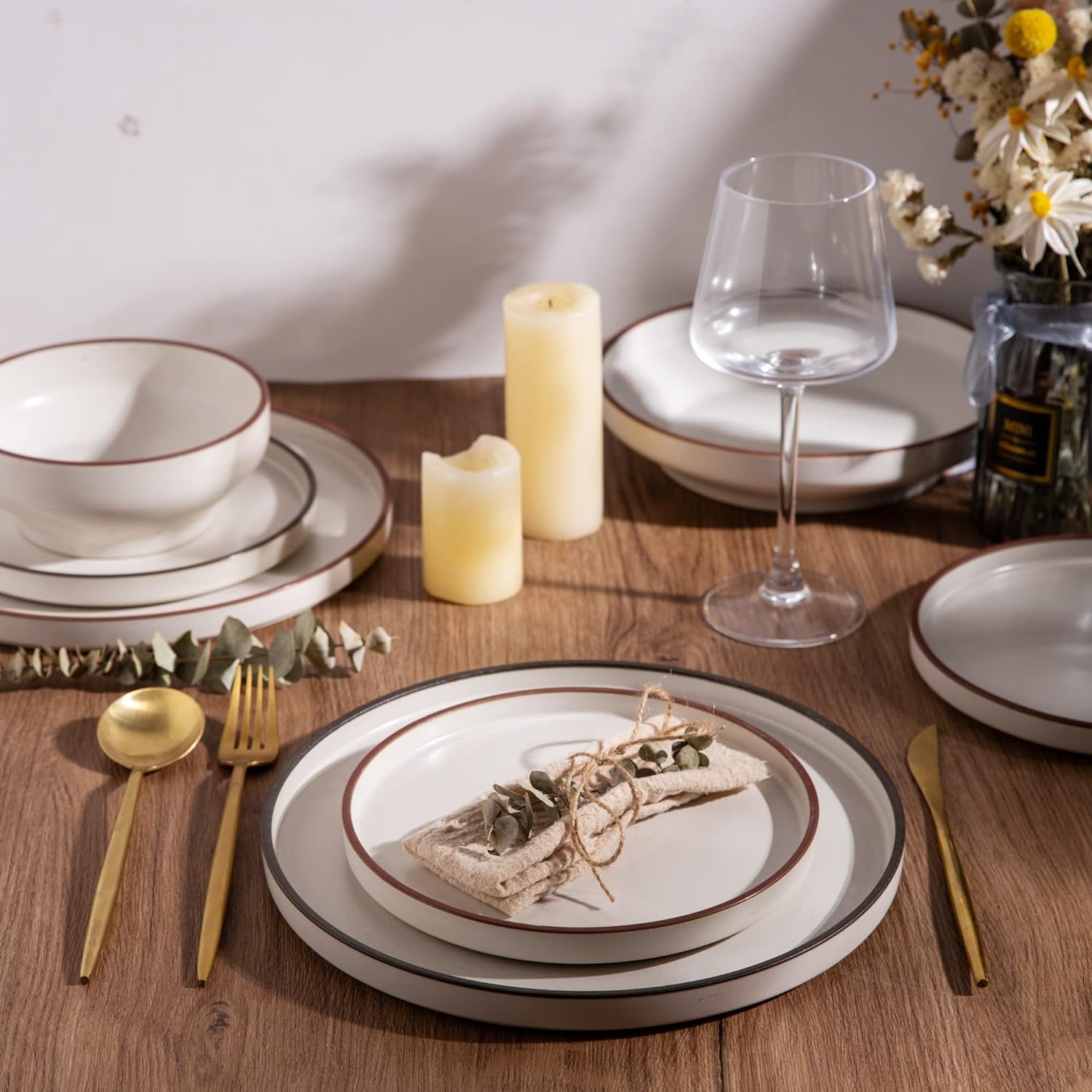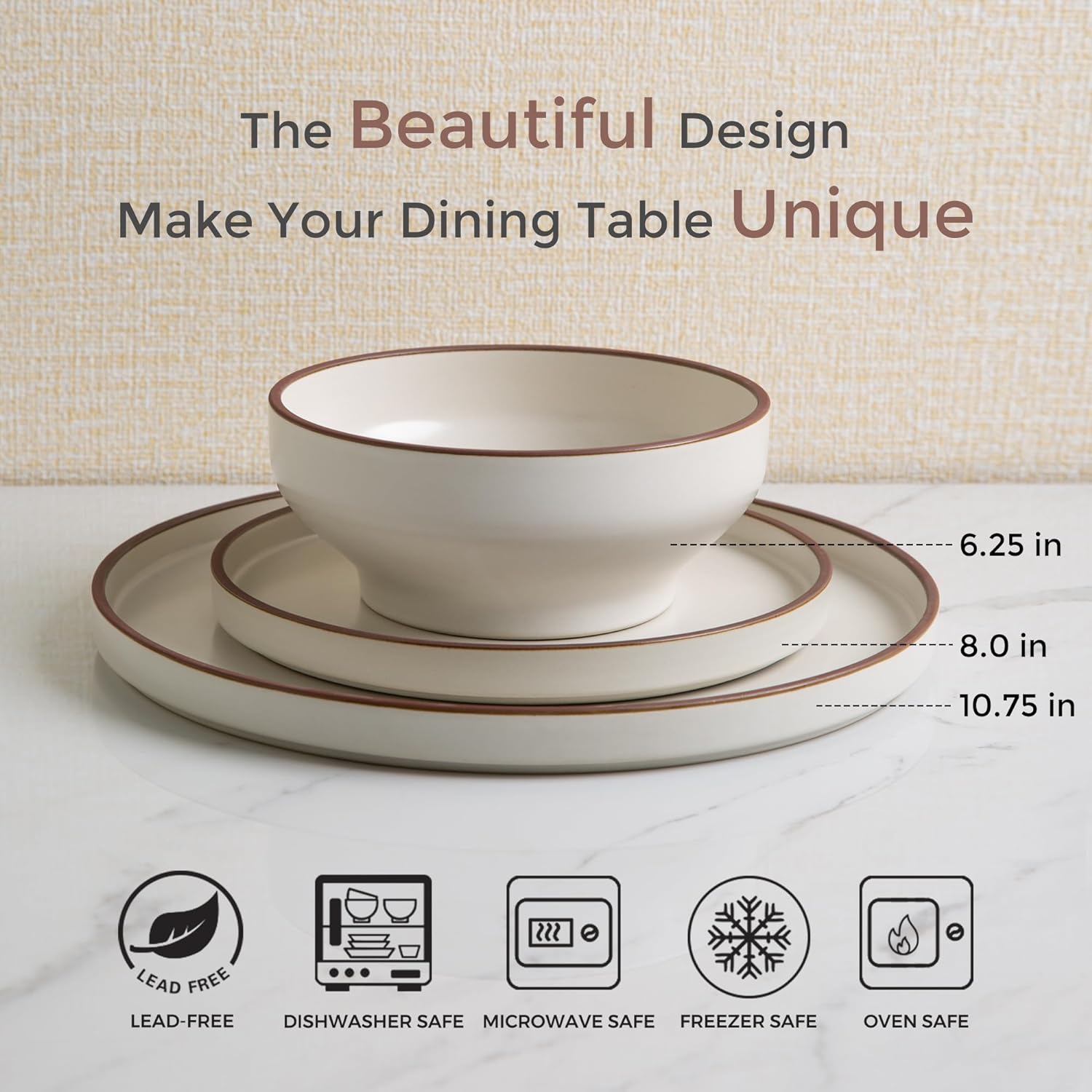 LERATIO Ceramic Dinnerware Sets of 4, High Edge Stoneware Plates and Bowls Set, Chip and Crack Resistant | Oven & Dishwasher & Microwave Safe Dishes Set, Service for 4 - Matte Coffee Rim (12 PCS)