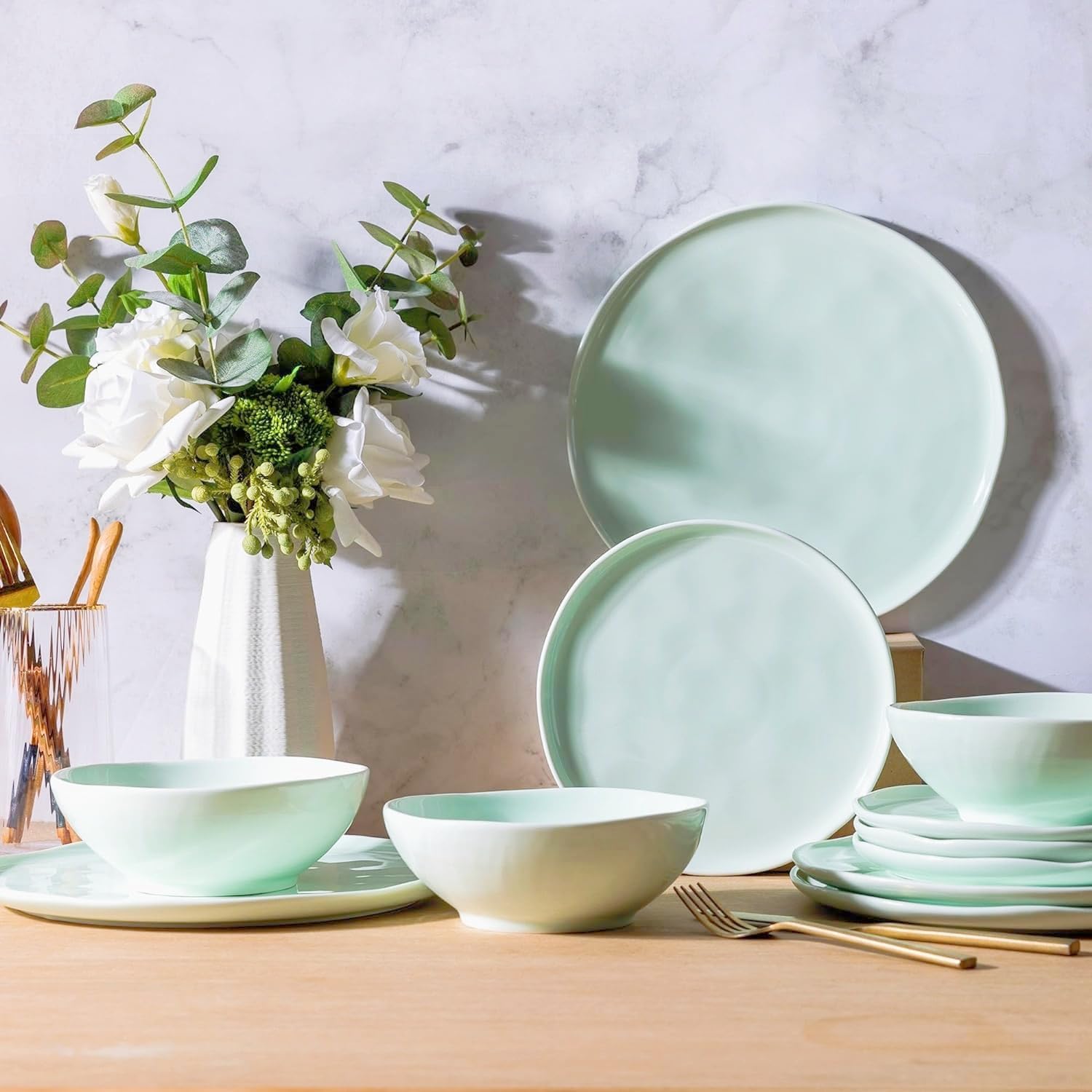 LERATIO Ceramic Dinnerware Sets of 4,Porcelain Plates and Bowls Sets with Wavy Edge,Microwave & Dishwasher & Oven Safe,Light Weight & Scratch Resistant Dishes Sets-Service for 4 (12pcs)-Light Green