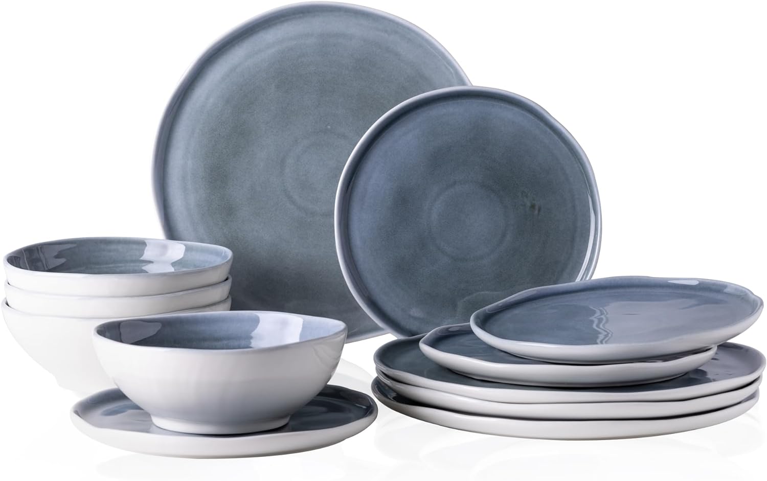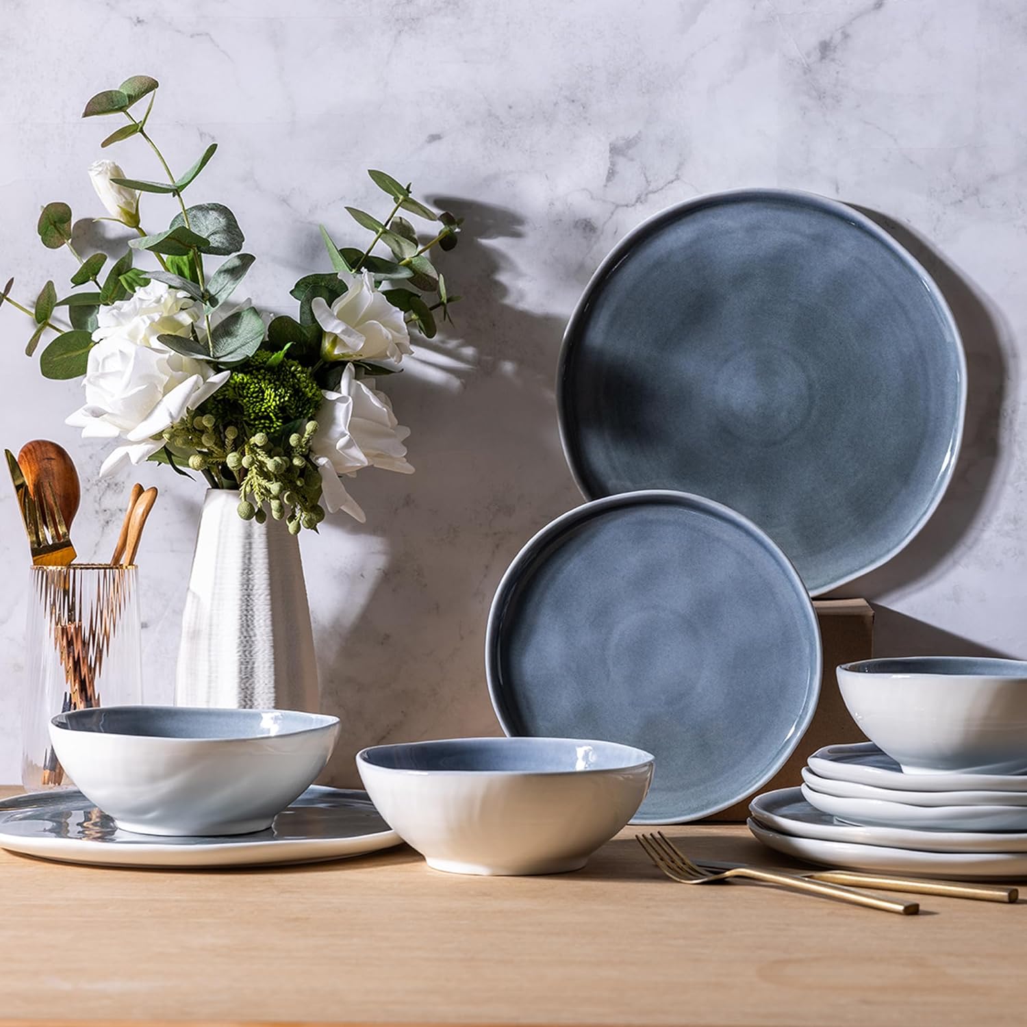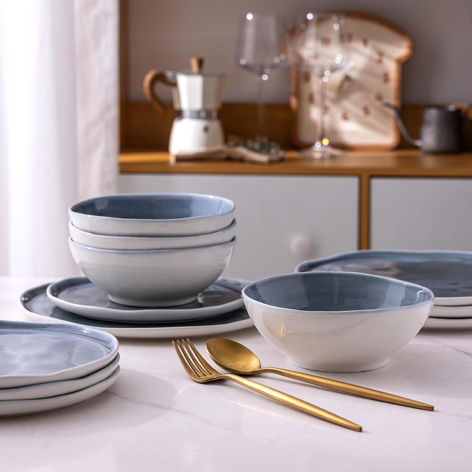 LERATIO Ceramic Dinnerware Sets of 4,Porcelain Plates and Bowls Sets with Wavy Edge,Microwave & Dishwasher & Oven Safe,Light Weight & Scratch Resistant Dishes Sets-Service for 4 (12pcs)-Light Jean Blue