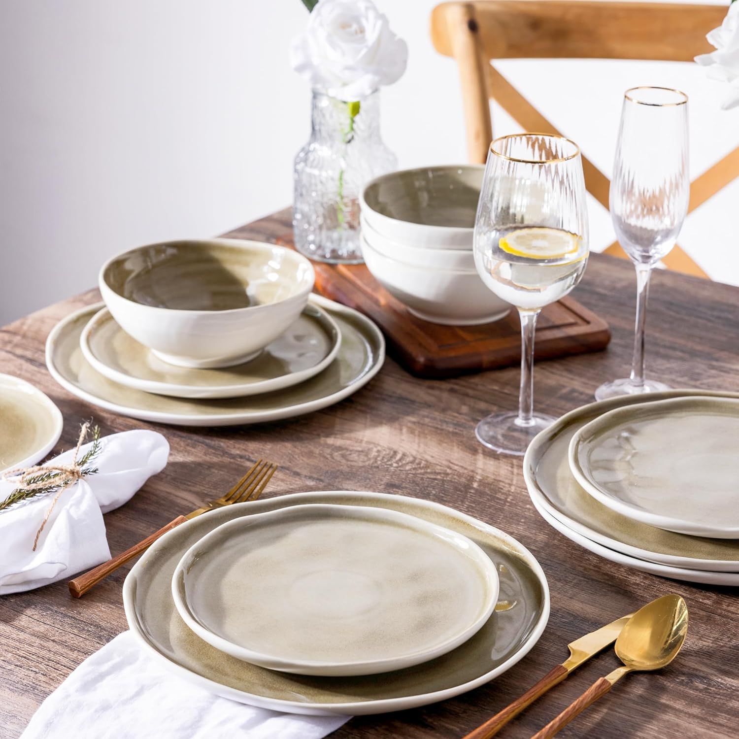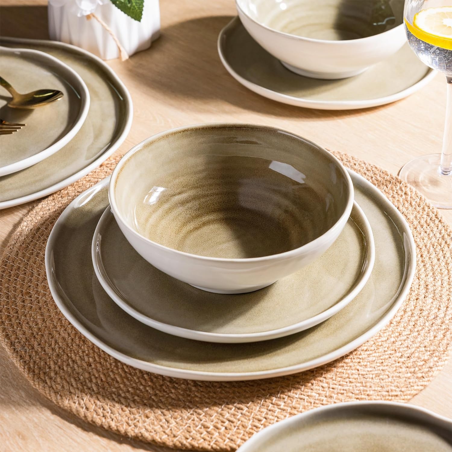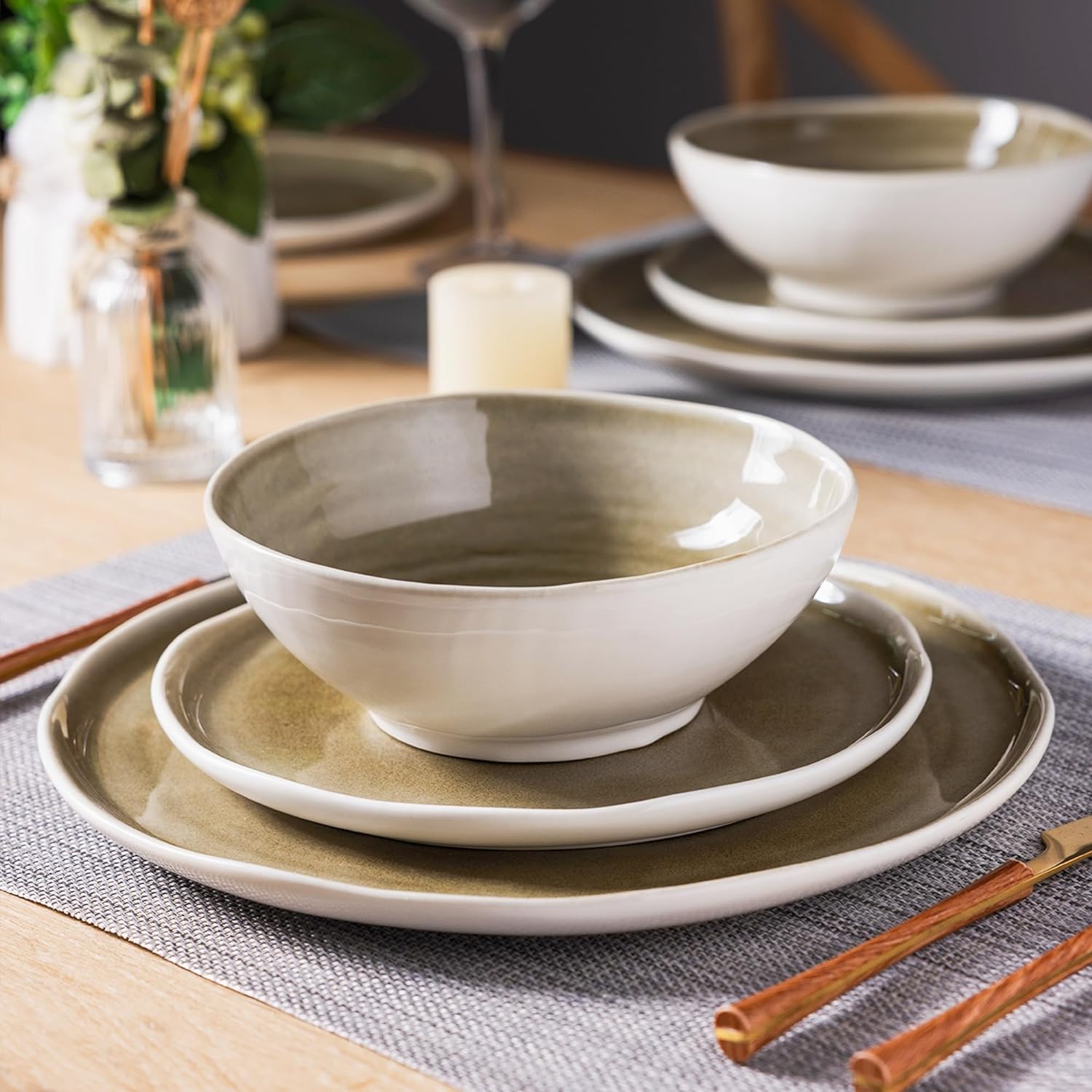 Leratio Ceramic Dinnerware Sets of 4,Porcelain Plates and Bowls Sets with Wavy Edge,Microwave & Dishwasher & Oven Safe,Light Weight & Scratch Resistant Dishes Sets-Service for 4 (12pcs)-Olive