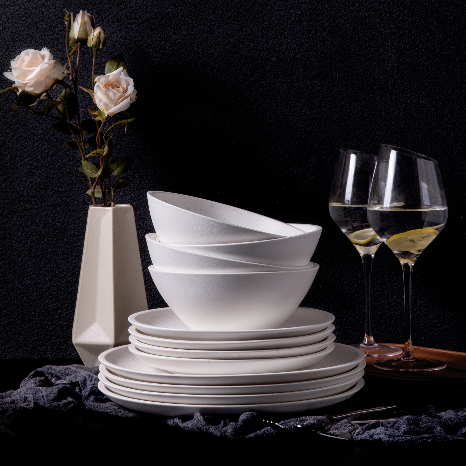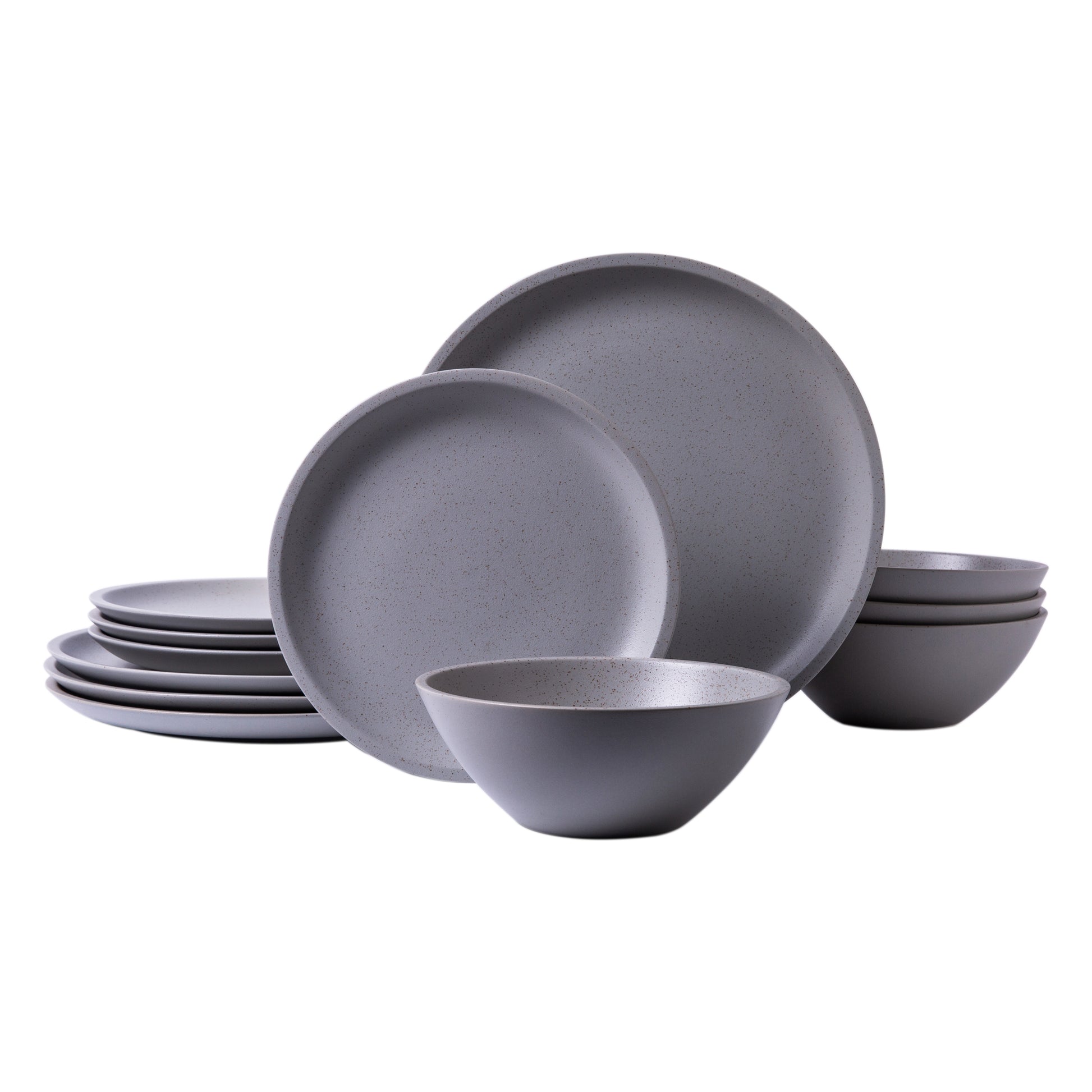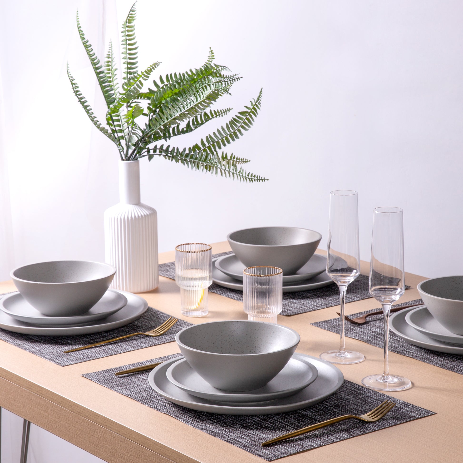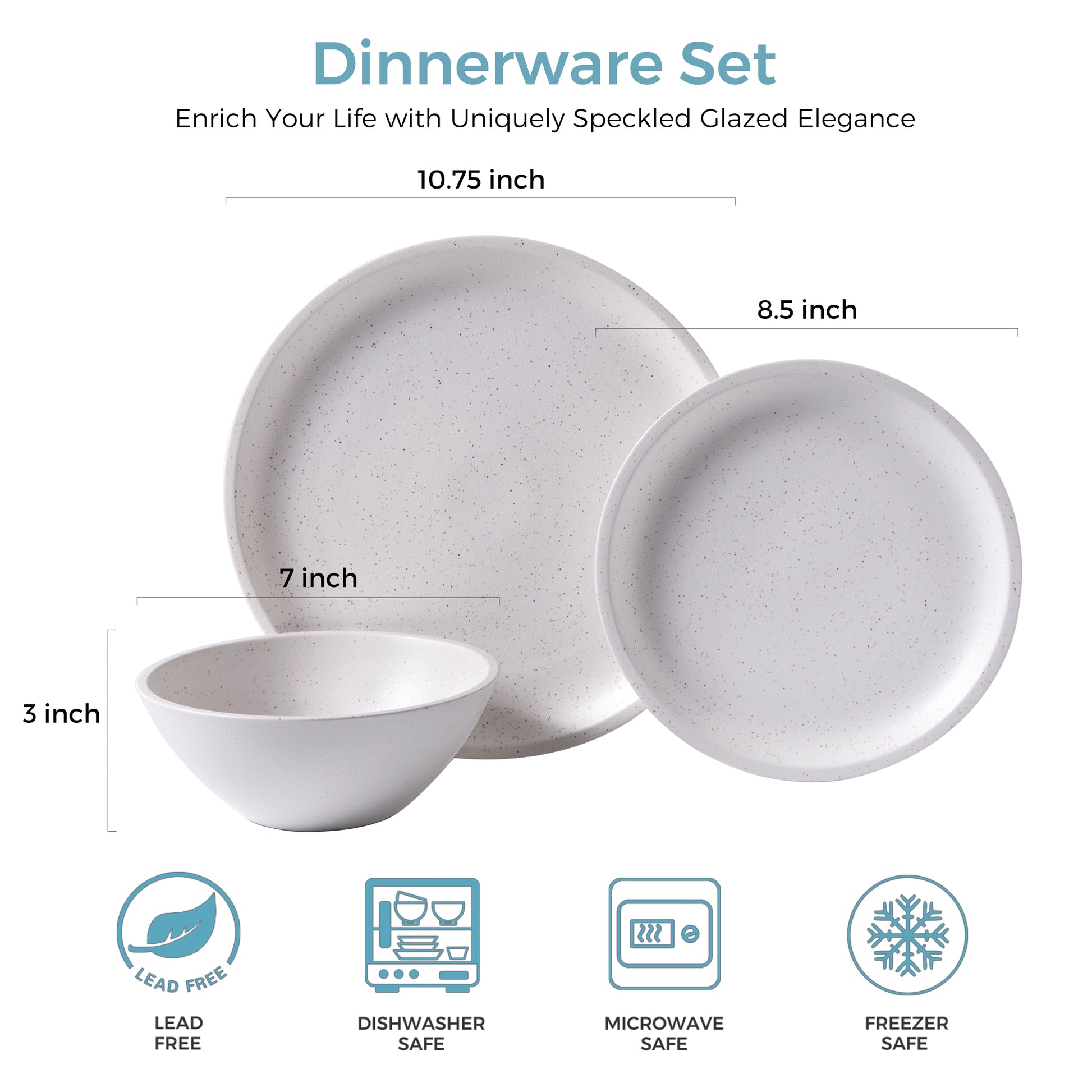 Porcelain Dinnerware Sets, Round Matte Speckled Glaze Plates and Bowls Set, Highly Chip and Crack Resistant, Dishwasher & Microwave Safe,Service for 4 (12pc), Black, White, Grey, Yellow