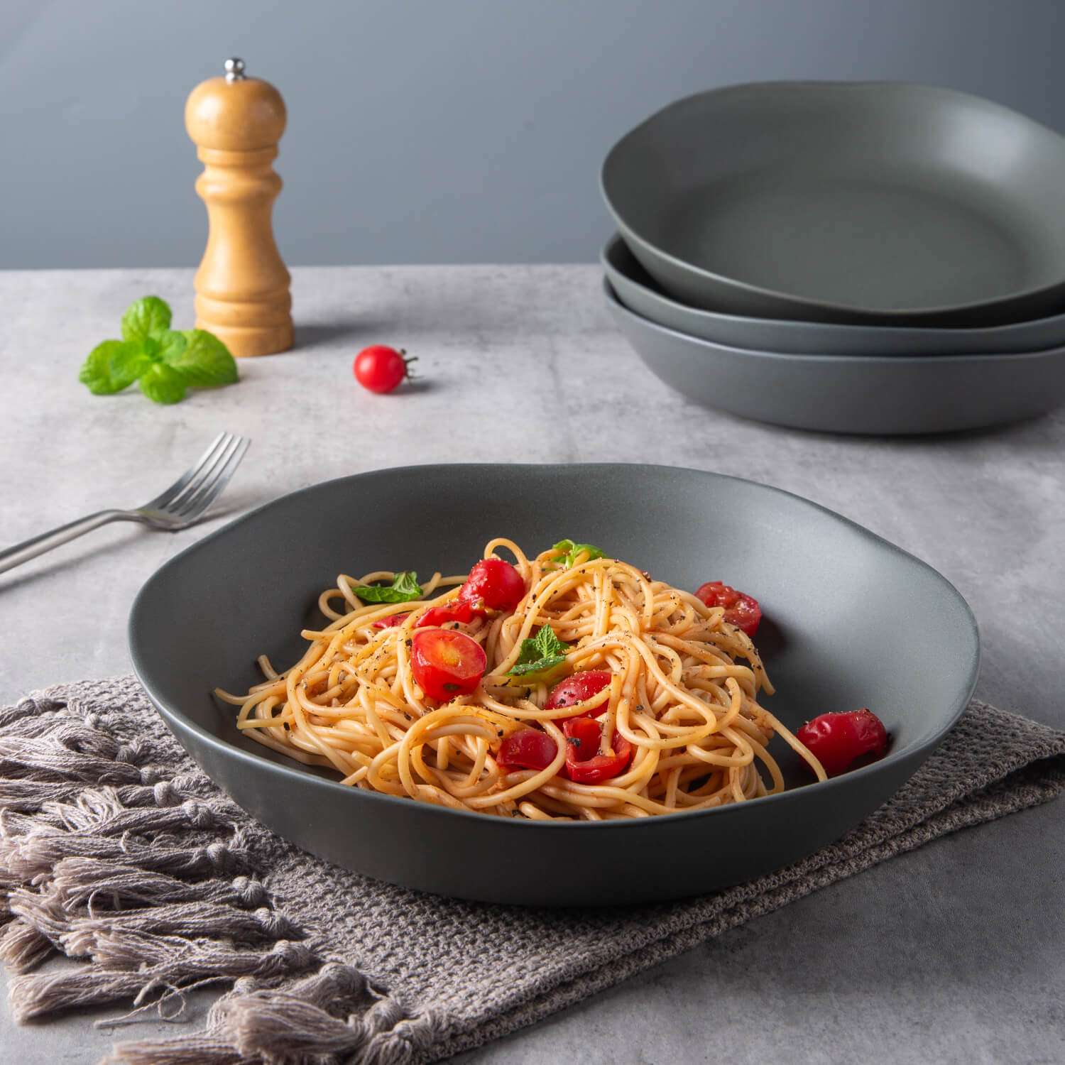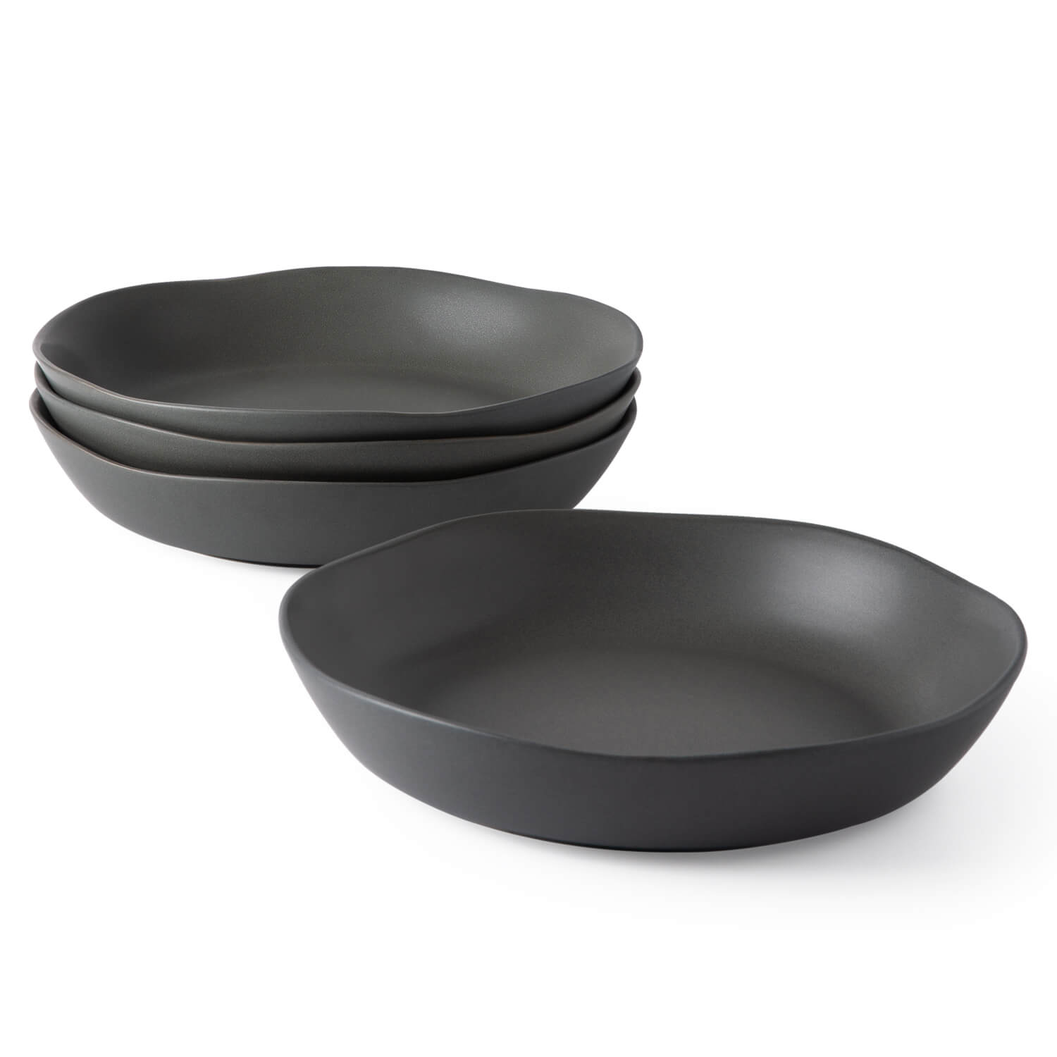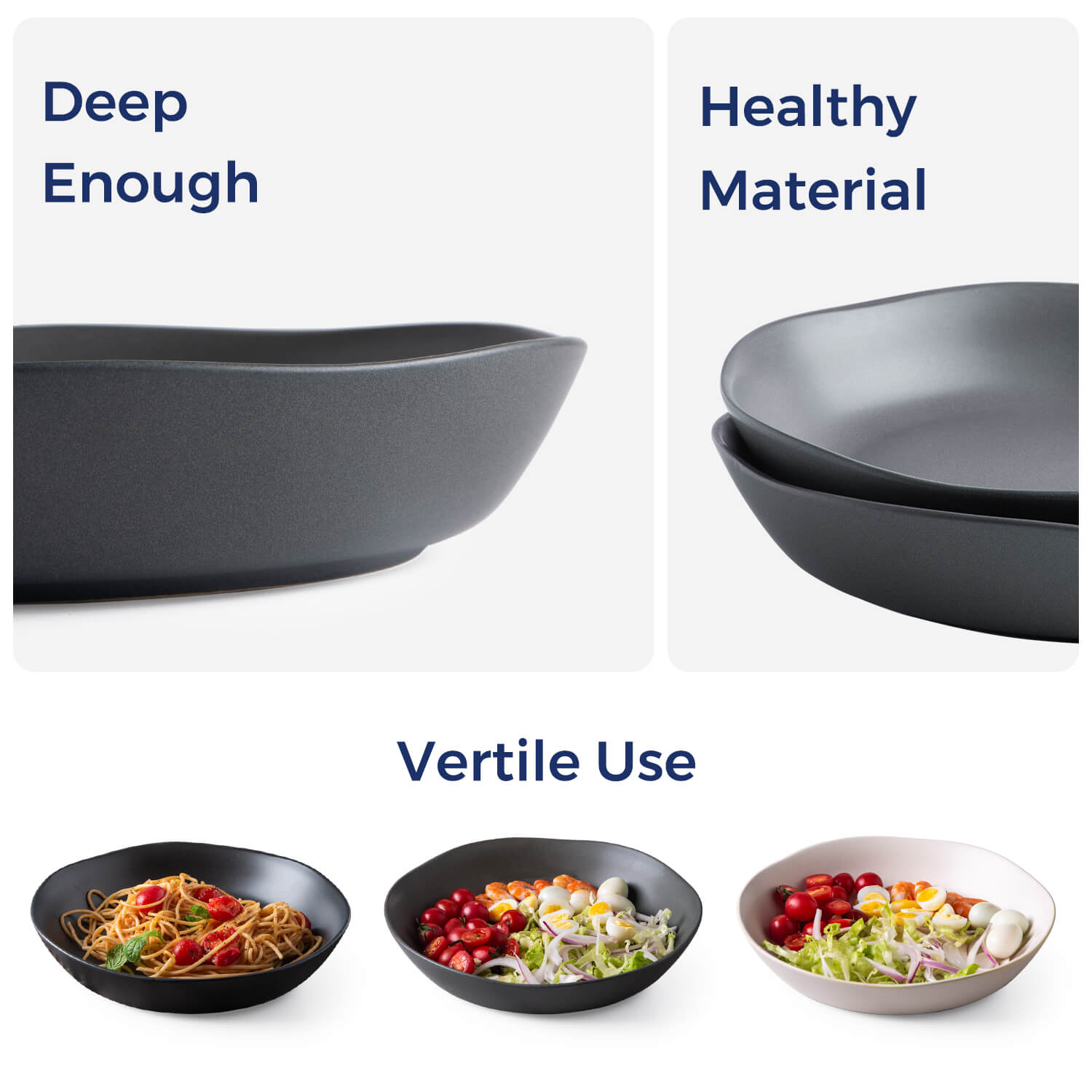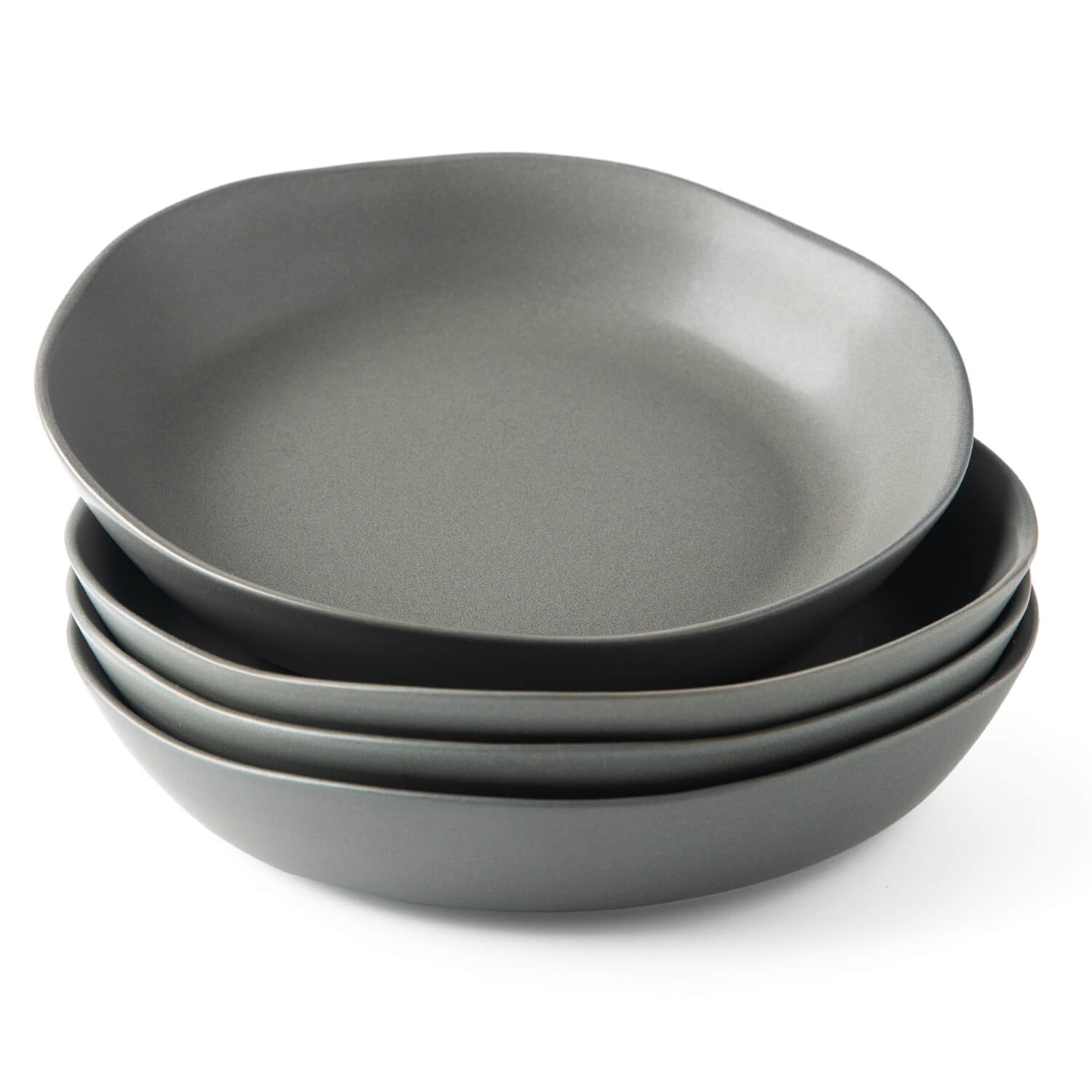 9.75 inch Stoneware Flat Pasta Bowls, 38oz Large Wide Bowls Set of 4 for Kitchen, Microwave Safe Bowls with Wavy Rim for Pasta Salad, Matte Green-ish Gray White Black