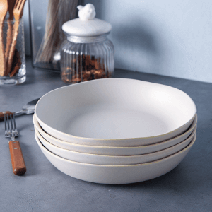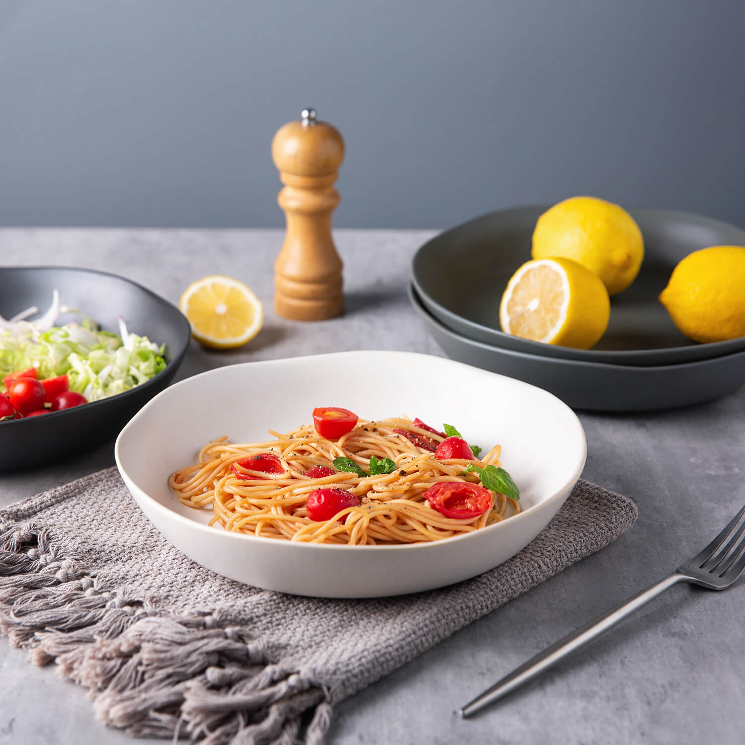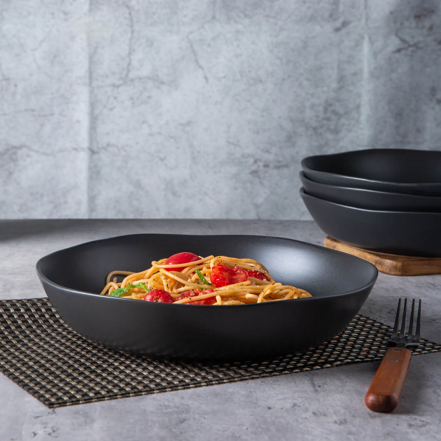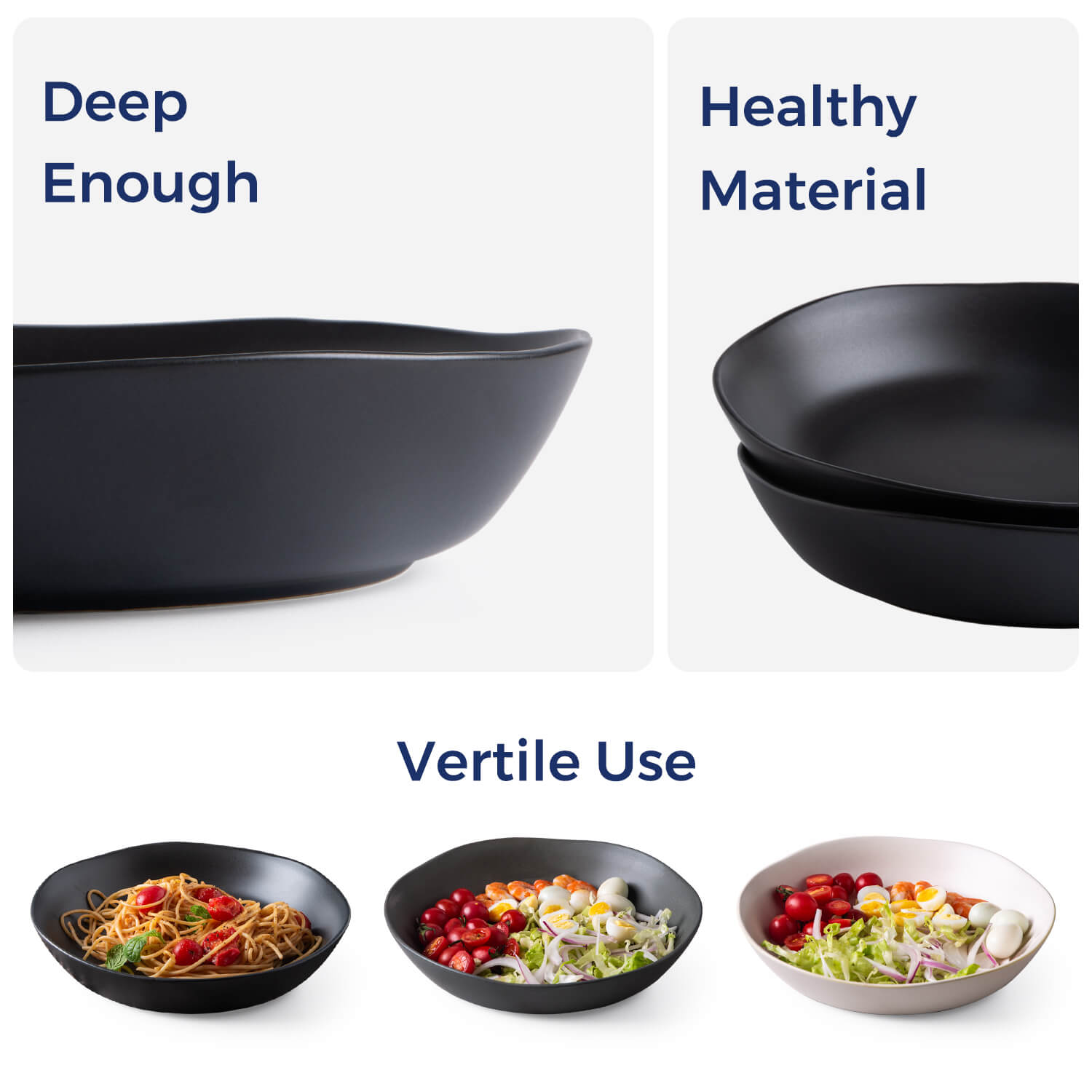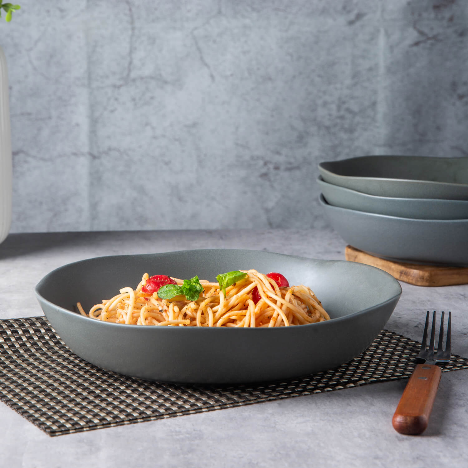 9.75 inch Stoneware Flat Pasta Bowls, 38oz Large Wide Bowls Set of 4 for Kitchen, Microwave Safe Bowls with Wavy Rim for Pasta Salad, Matte Green-ish Gray White Black