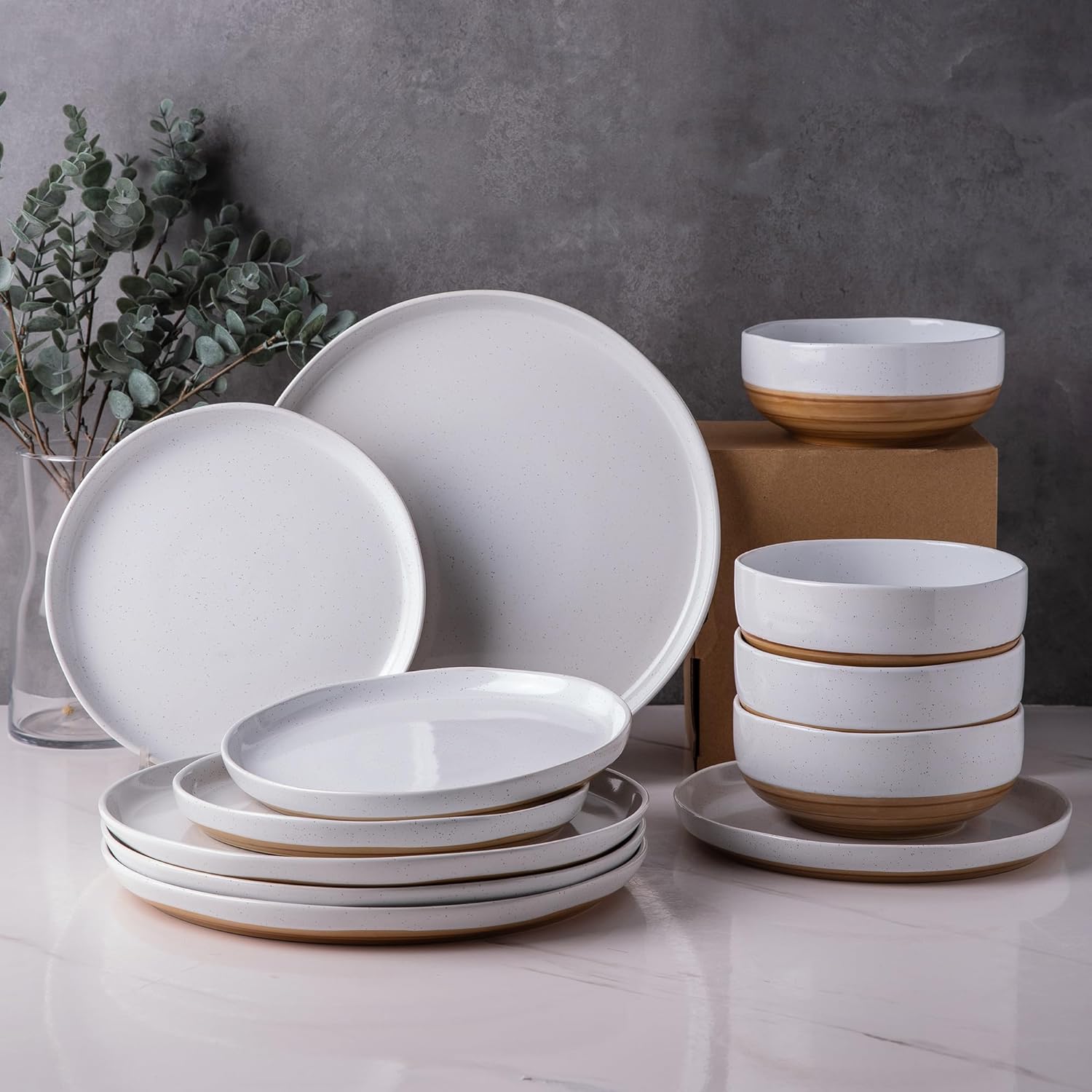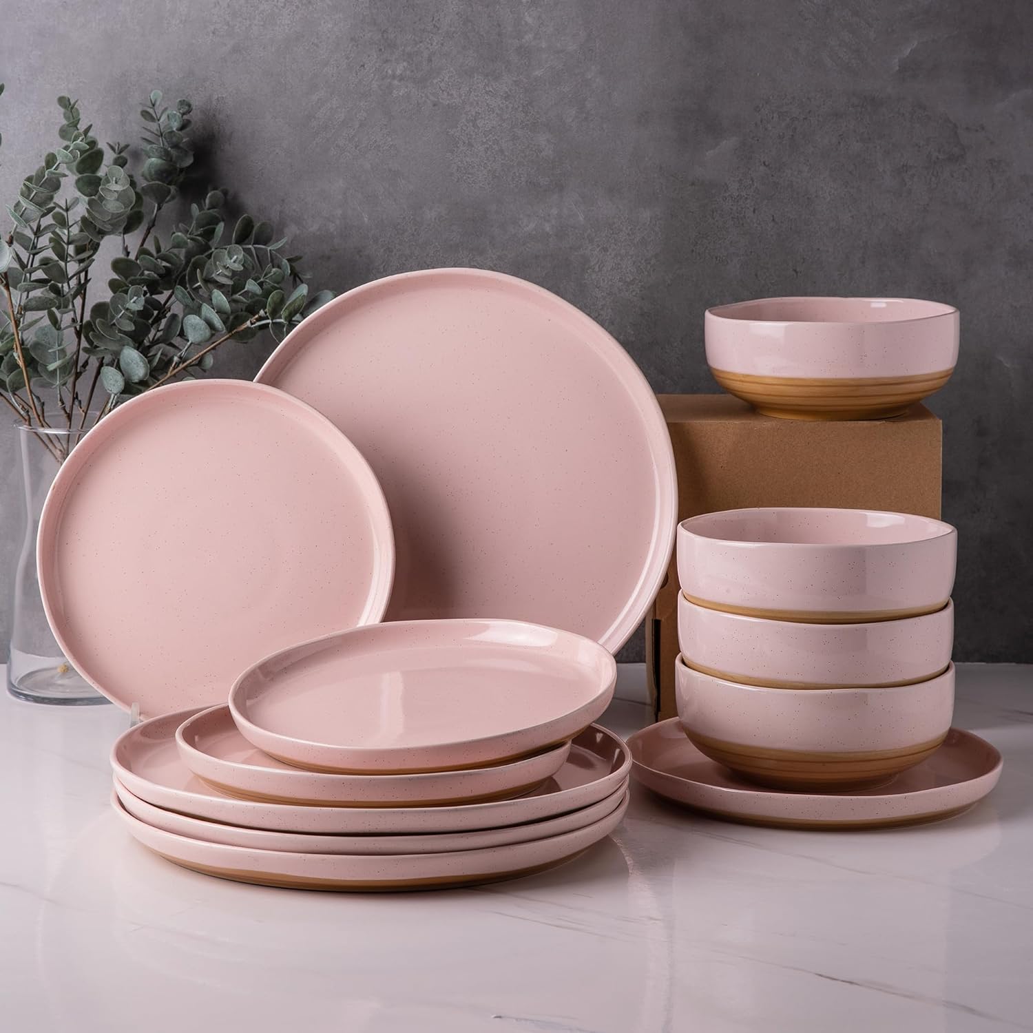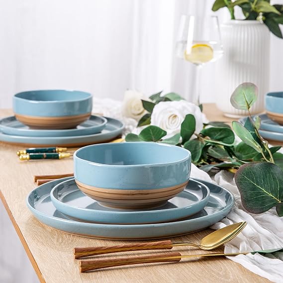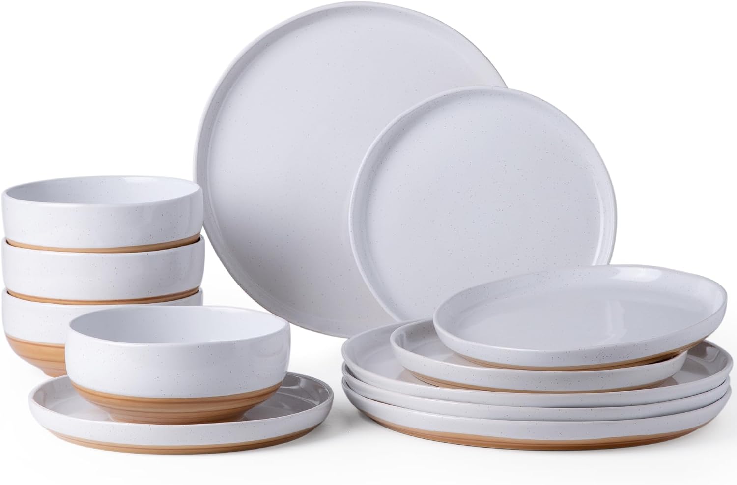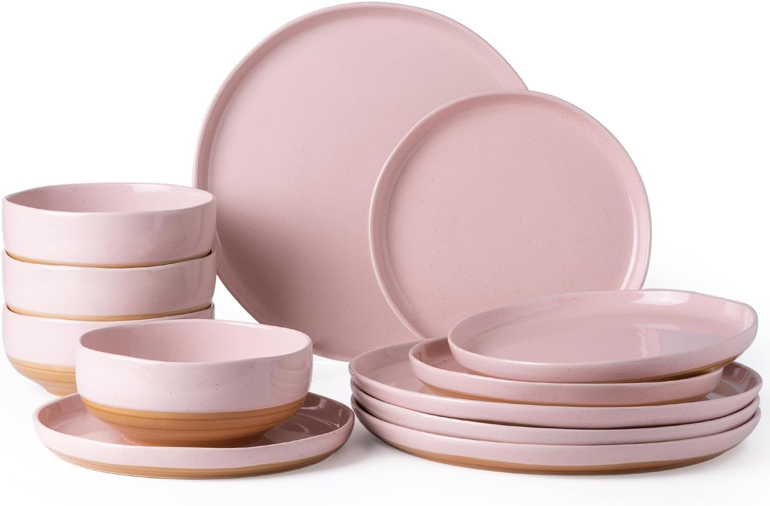 AmorArc Ceramic Dinnerware Sets, Handmade Dinnerware Plates and Bowls Set, Highly Chip and Crack Resistant | Dishwasher & Microwave Safe, Service for 4 (12pc)-Speckled White Ivory Pink Gray Blue Navy