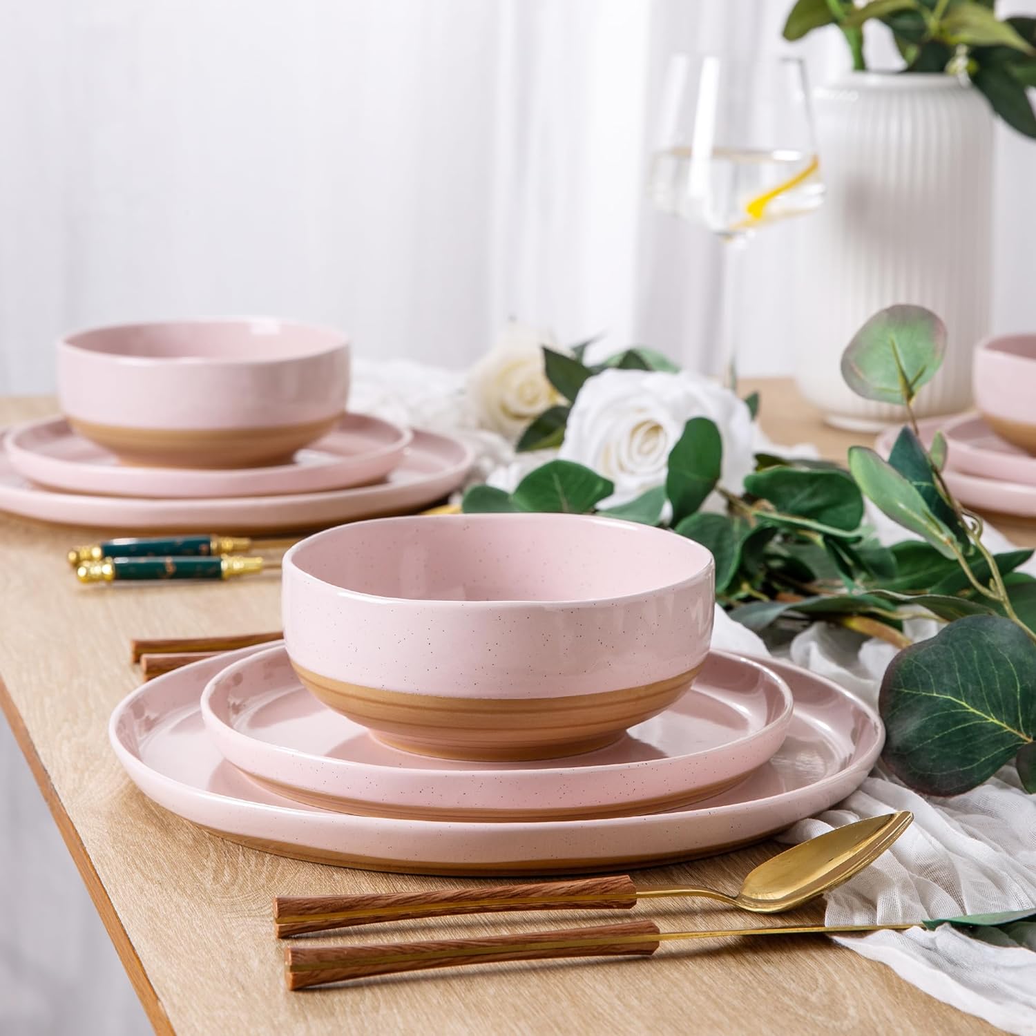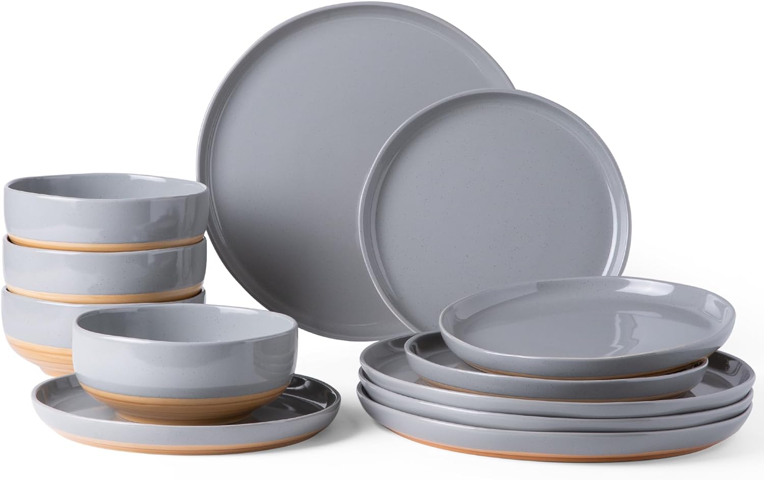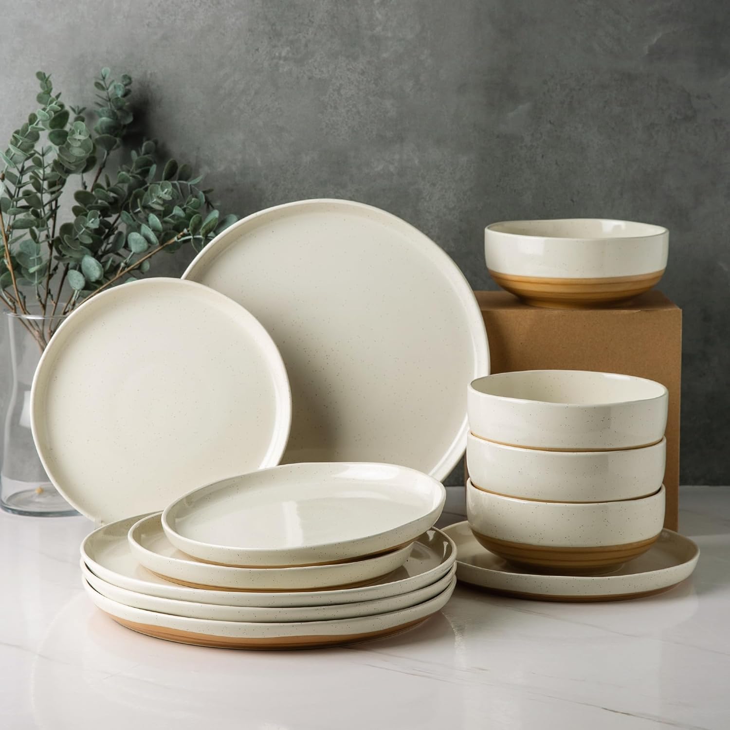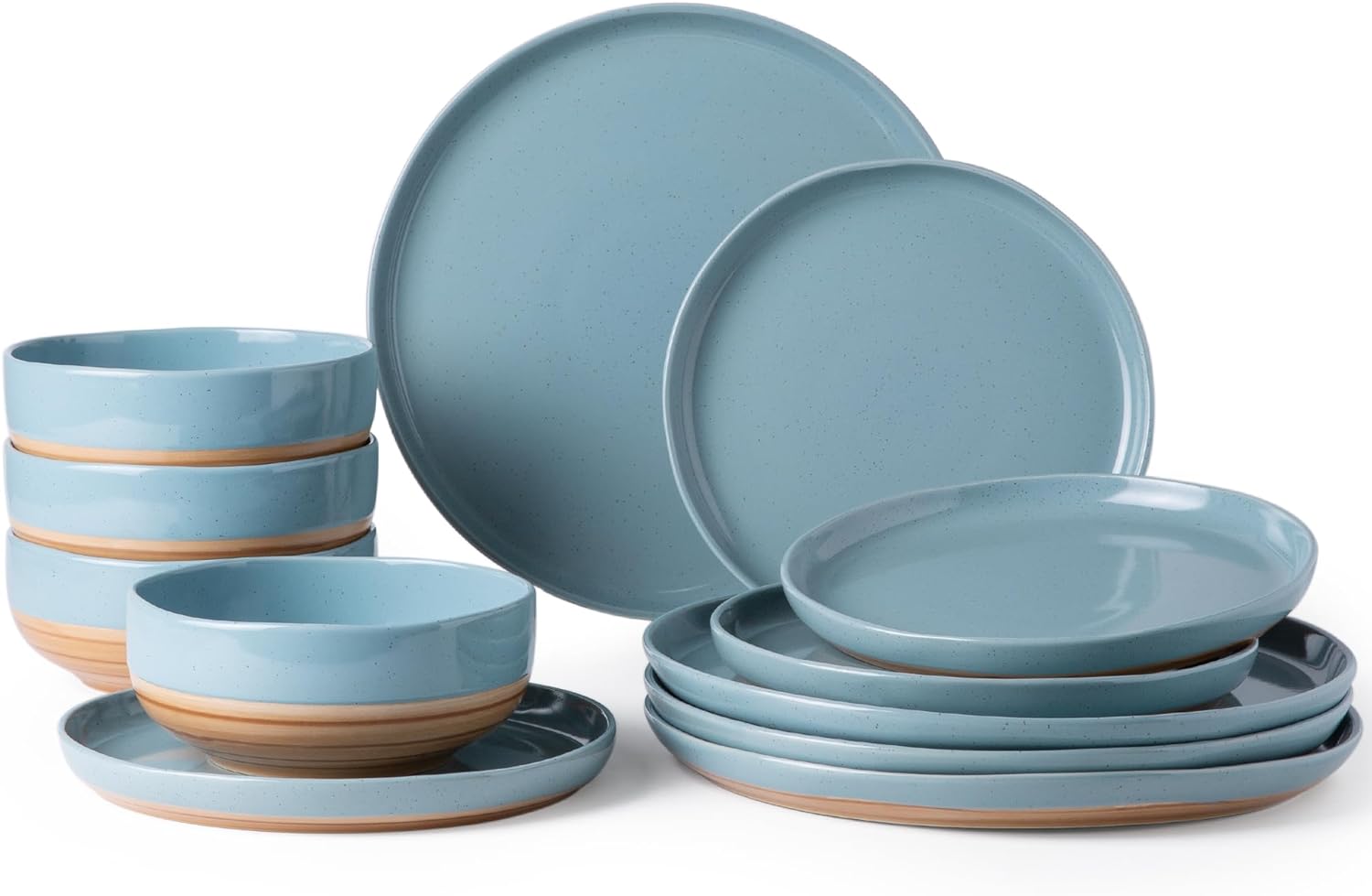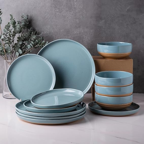 AmorArc Ceramic Dinnerware Sets, Handmade Dinnerware Plates and Bowls Set, Highly Chip and Crack Resistant | Dishwasher & Microwave Safe, Service for 4 (12pc)-Speckled White Ivory Pink Gray Blue Navy