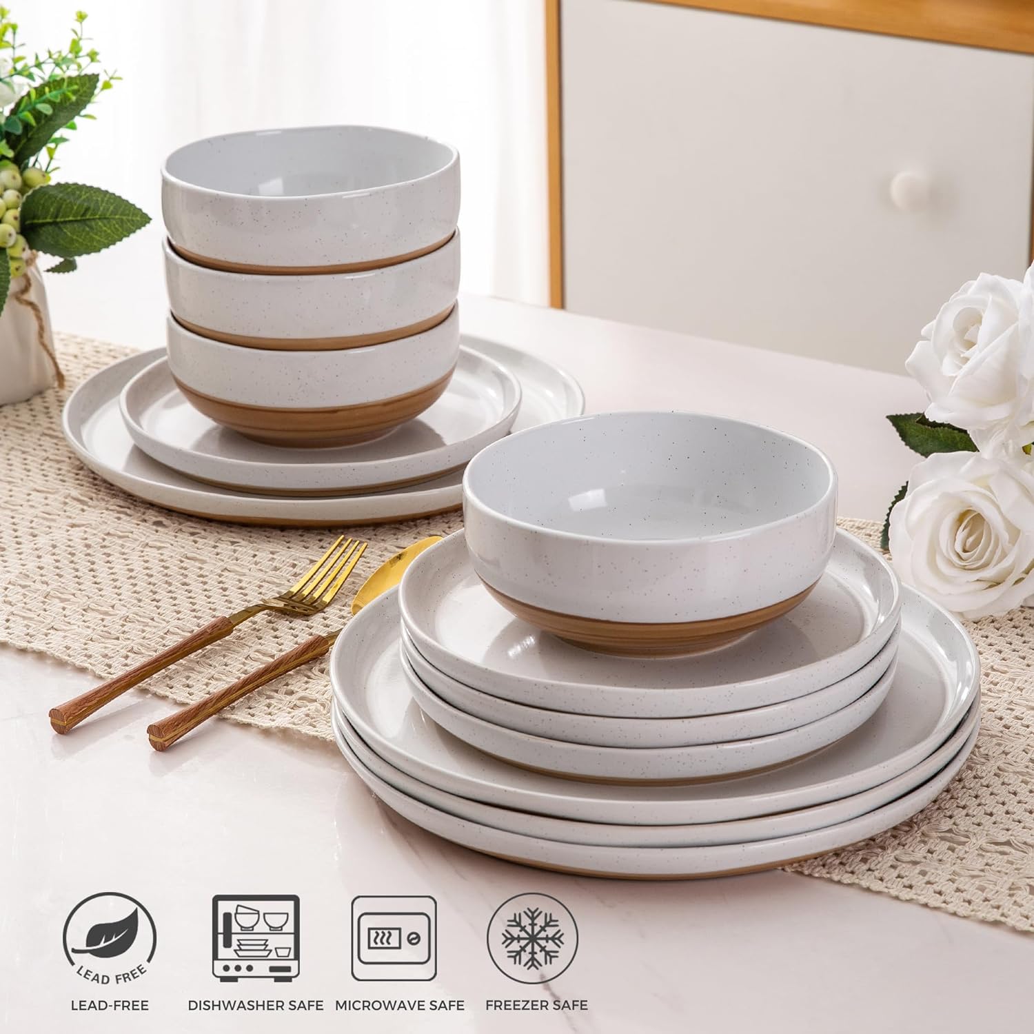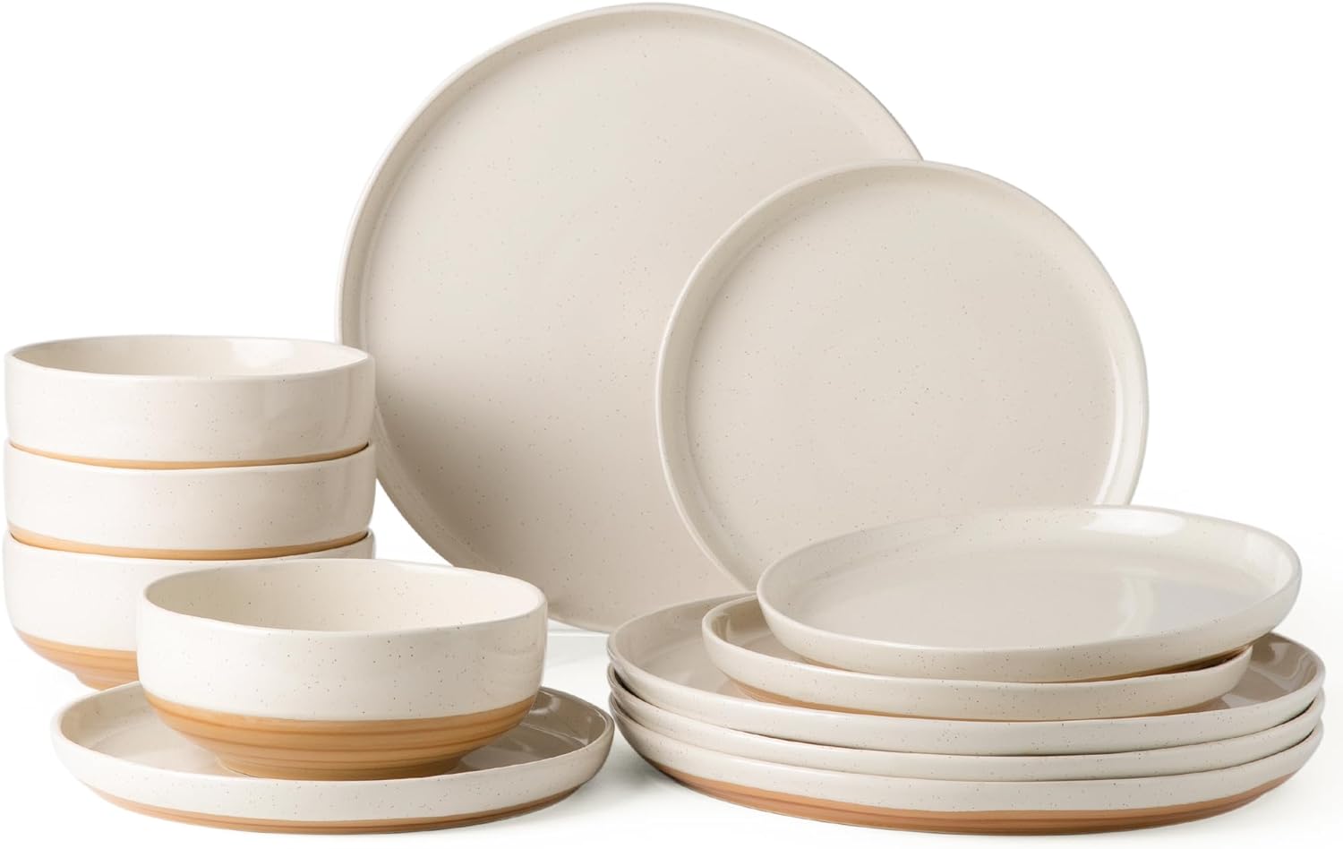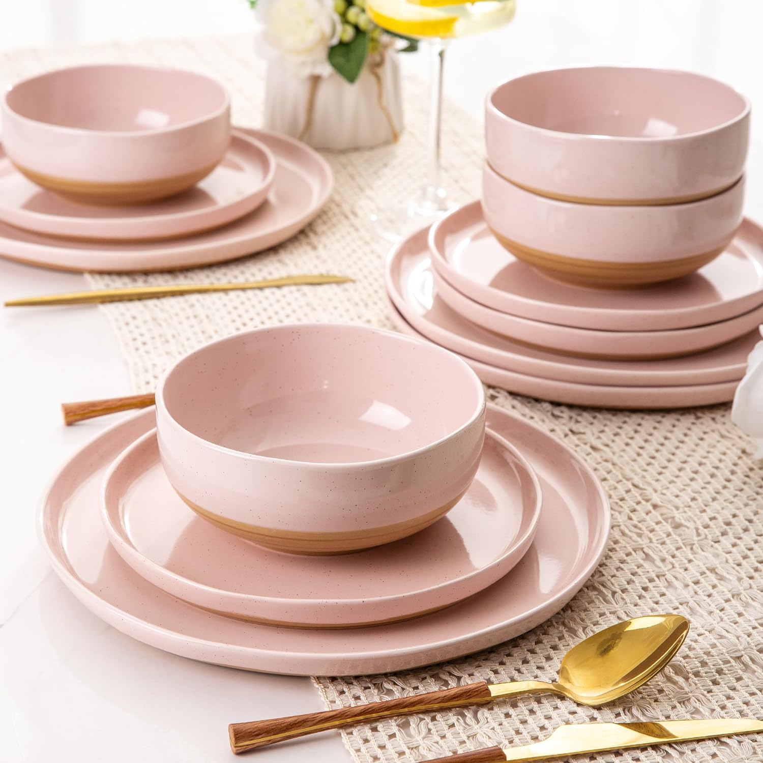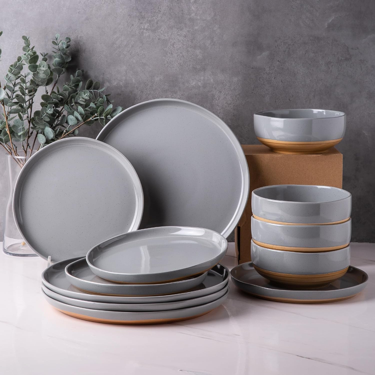 AmorArc Ceramic Dinnerware Sets, Handmade Dinnerware Plates and Bowls Set, Highly Chip and Crack Resistant | Dishwasher & Microwave Safe, Service for 4 (12pc)-Speckled White Ivory Pink Gray Blue Navy