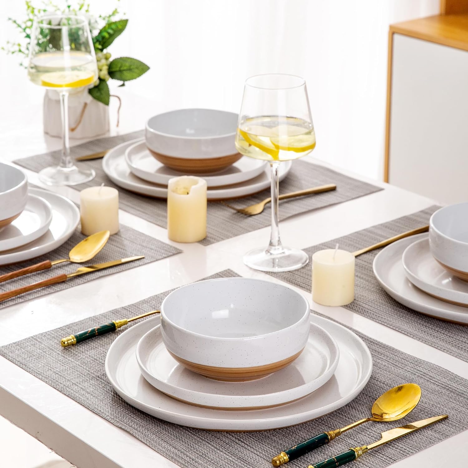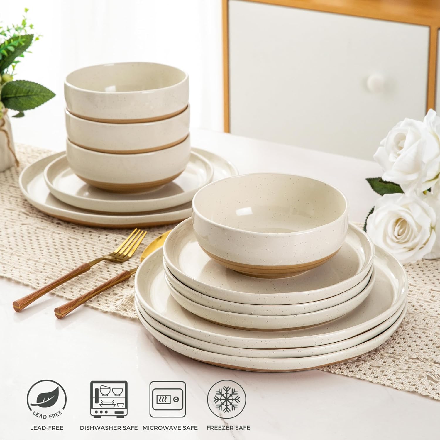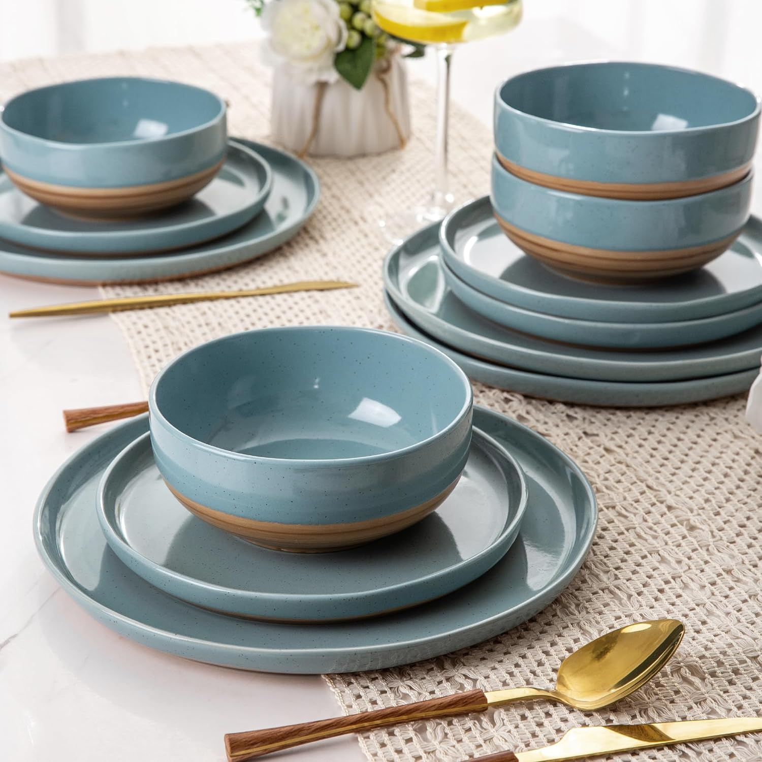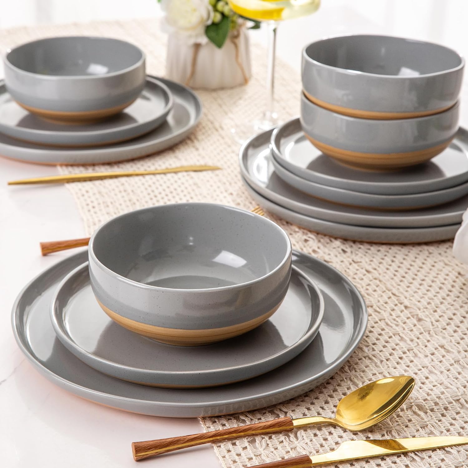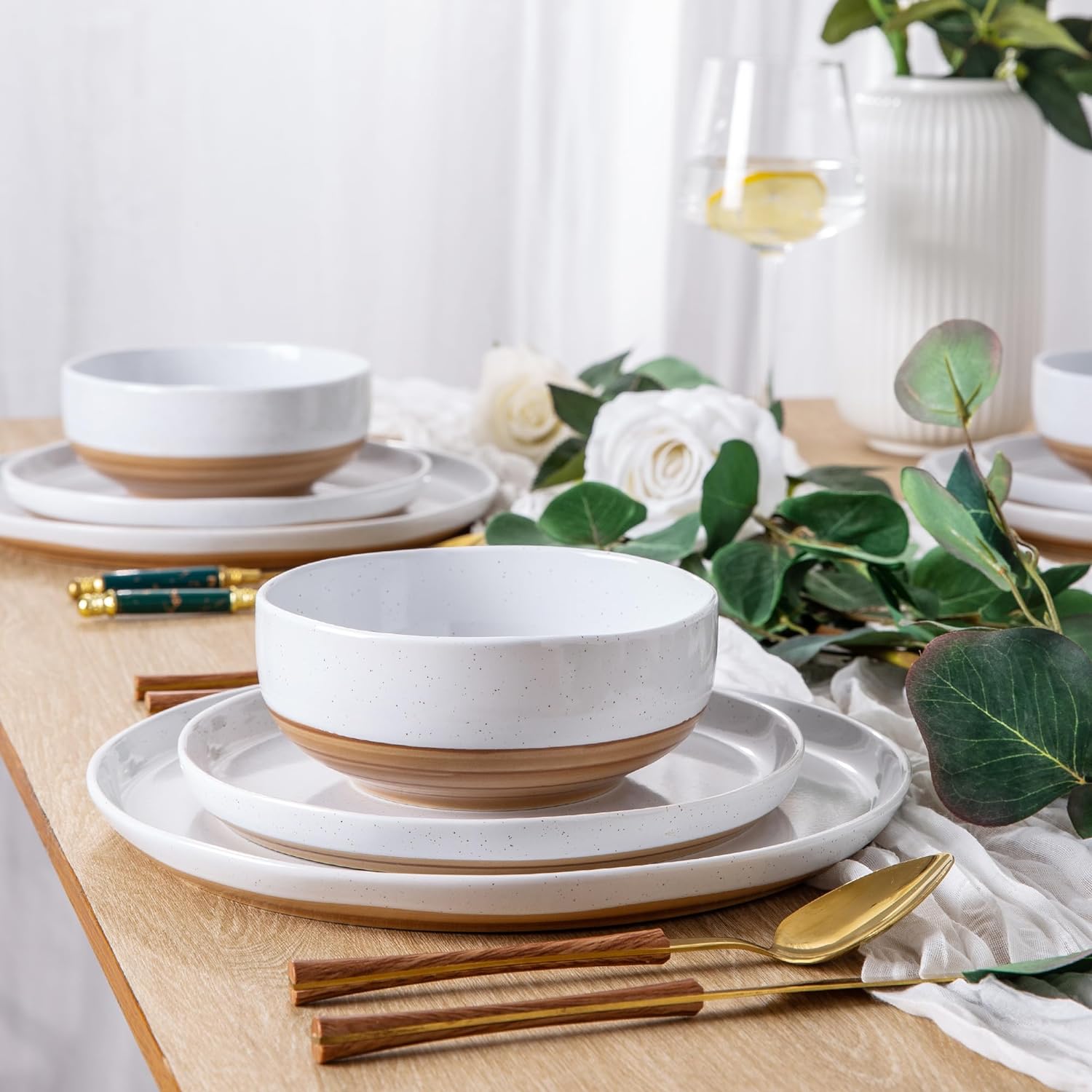 AmorArc Ceramic Dinnerware Sets, Handmade Dinnerware Plates and Bowls Set, Highly Chip and Crack Resistant | Dishwasher & Microwave Safe, Service for 4 (12pc)-Speckled White Ivory Pink Gray Blue Navy