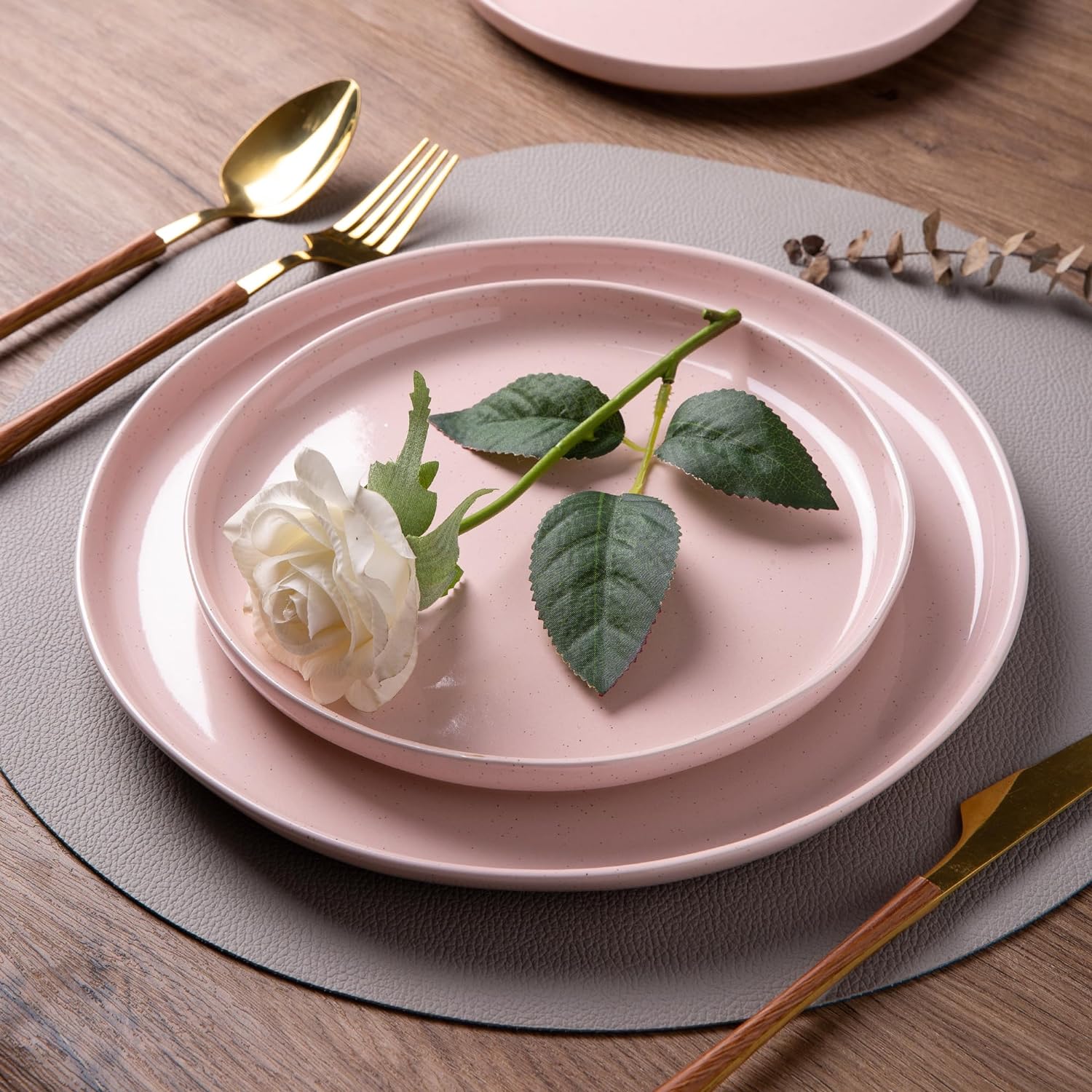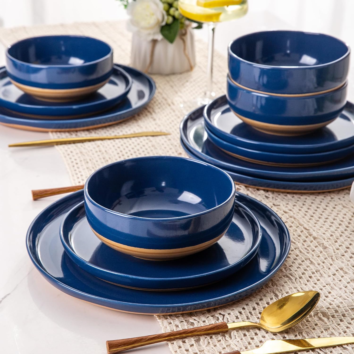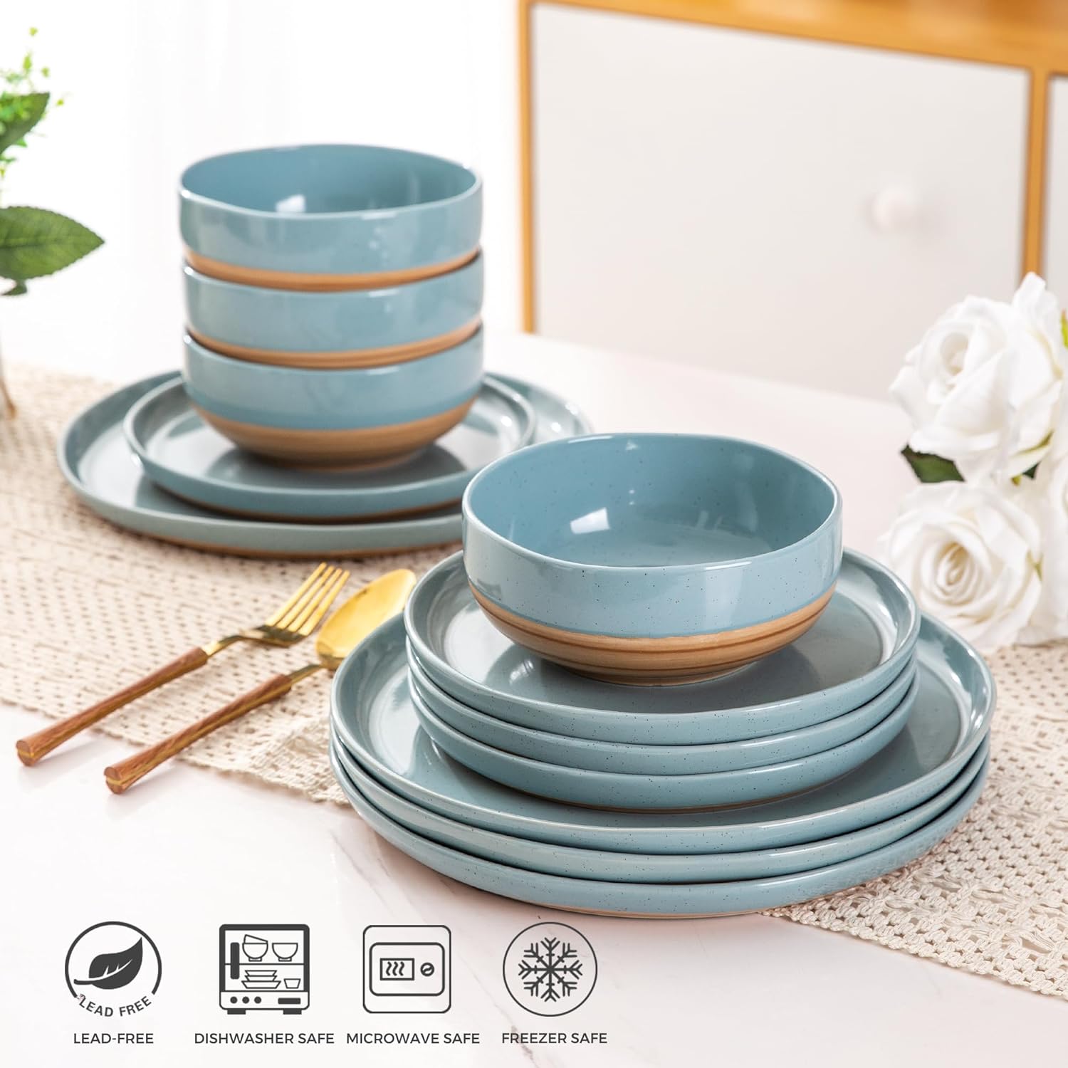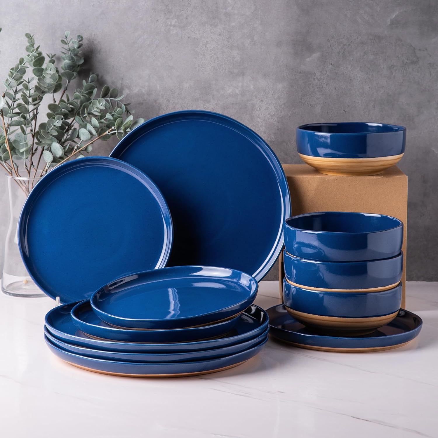 AmorArc Ceramic Dinnerware Sets, Handmade Dinnerware Plates and Bowls Set, Highly Chip and Crack Resistant | Dishwasher & Microwave Safe, Service for 4 (12pc)-Speckled White Ivory Pink Gray Blue Navy