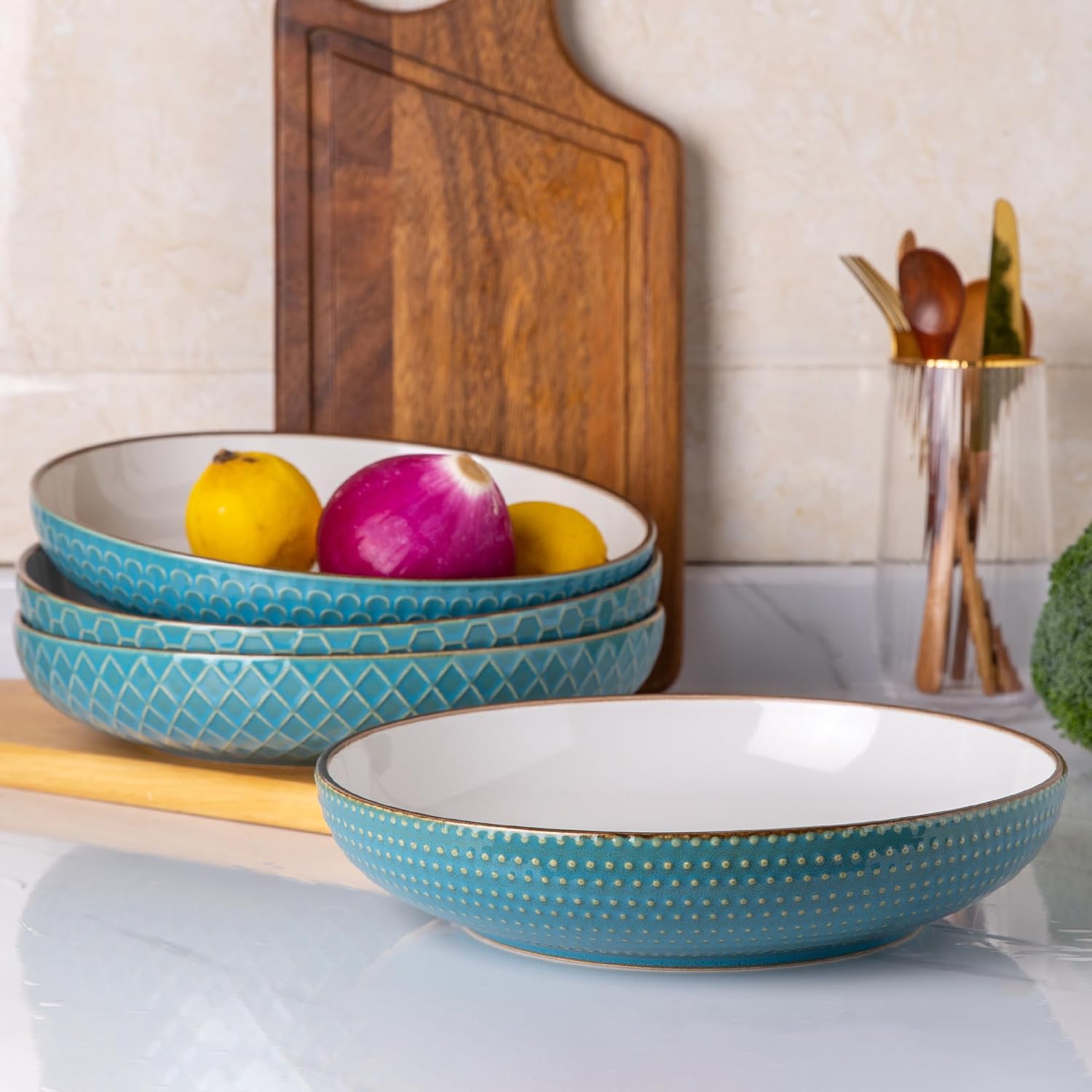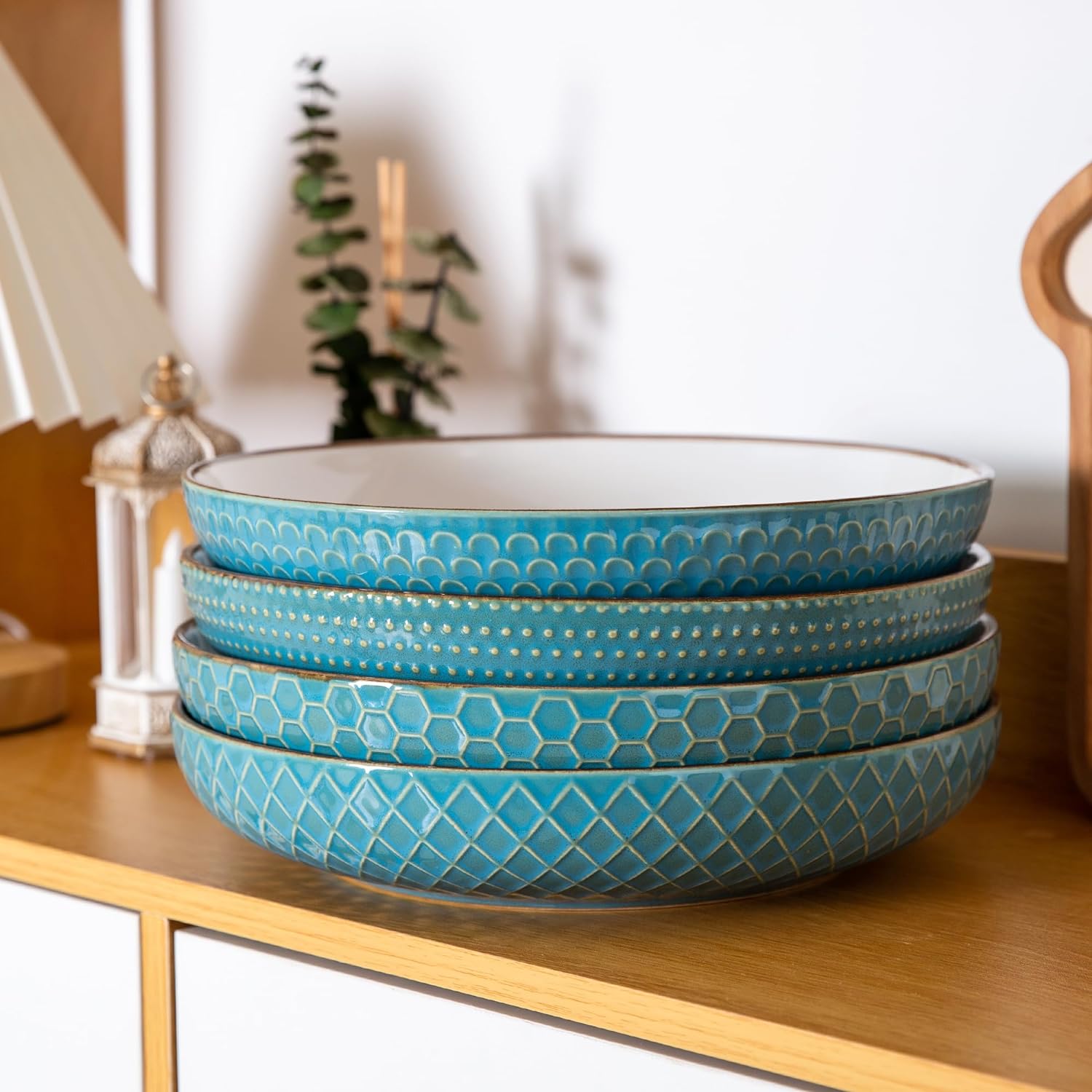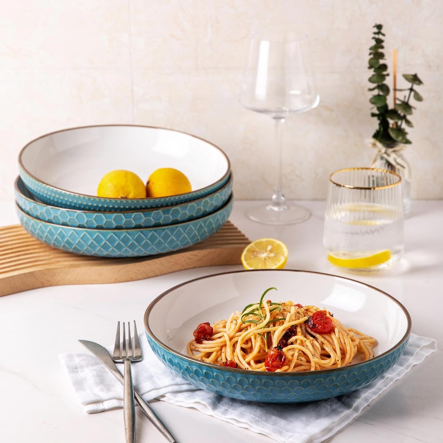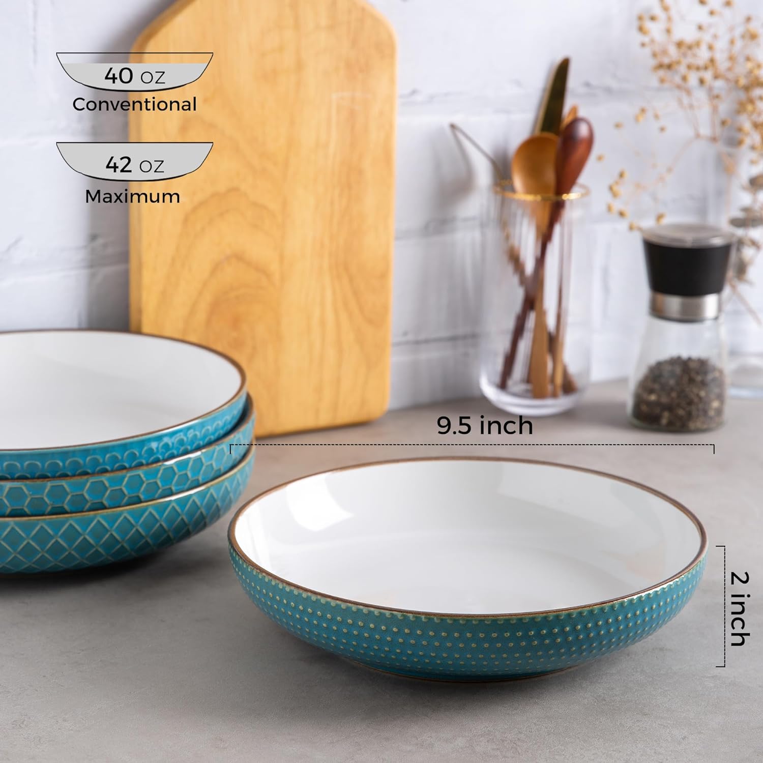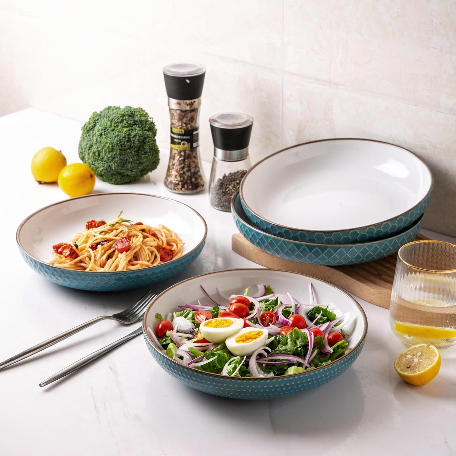 GBHOME 9.5'' Large Pasta Bowls, 42 Ounce Stoneware Salad Bowls for Kitchen, Ceramic Serving Bowls With Textured Pattern for Pasta,Fruit, Stews,Salad,Noodle, House-warming Gift,Set of 4-Off White, Cobat Blue,