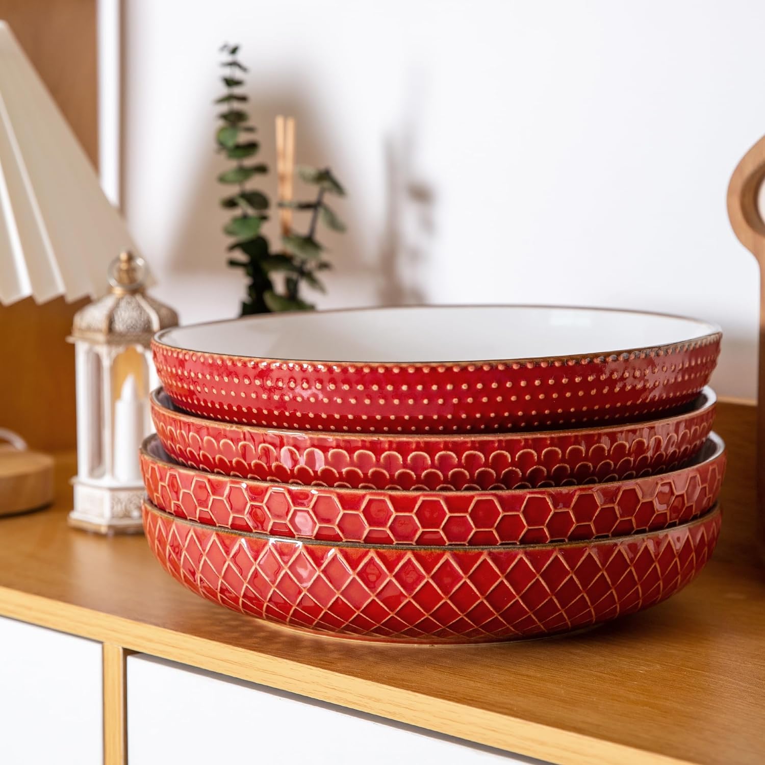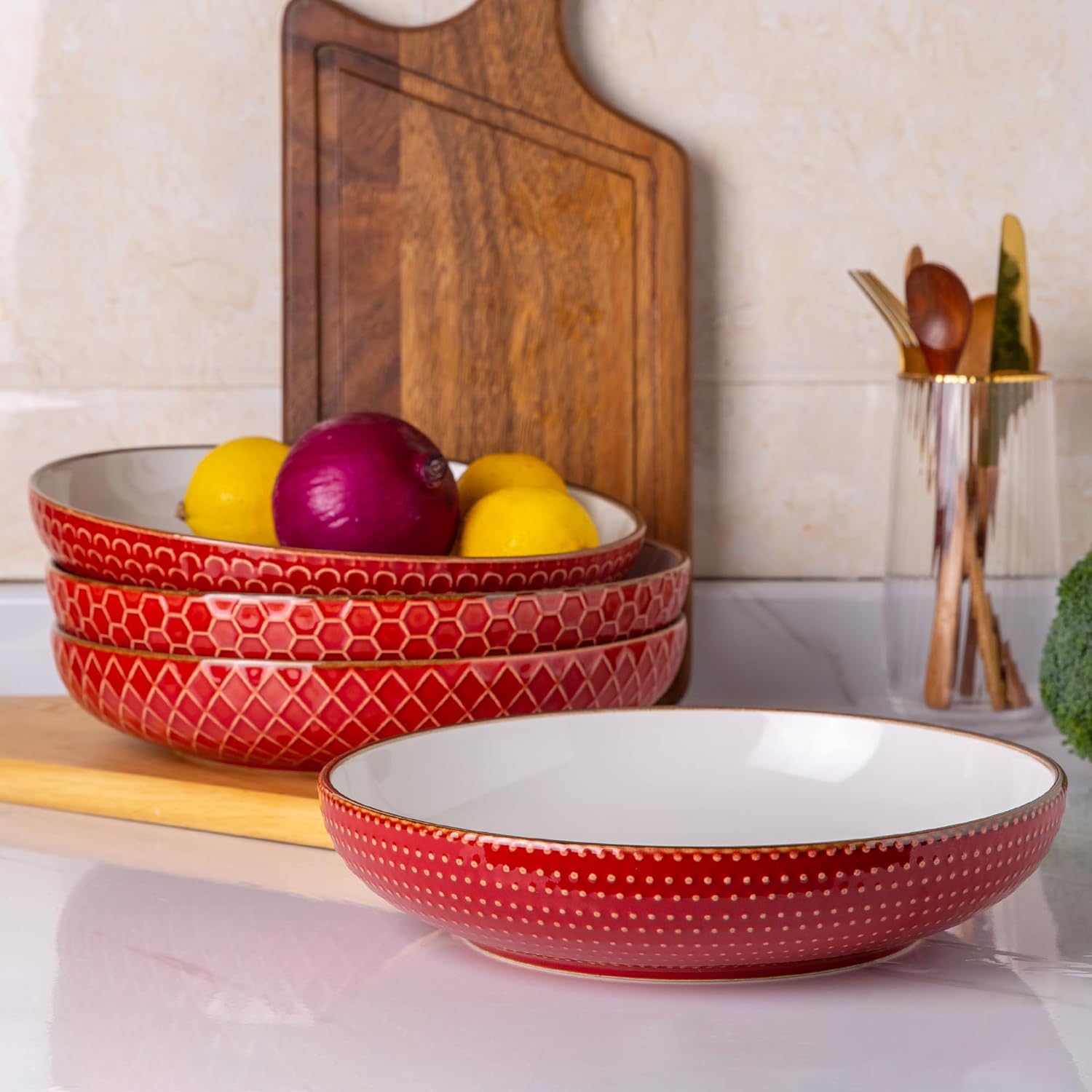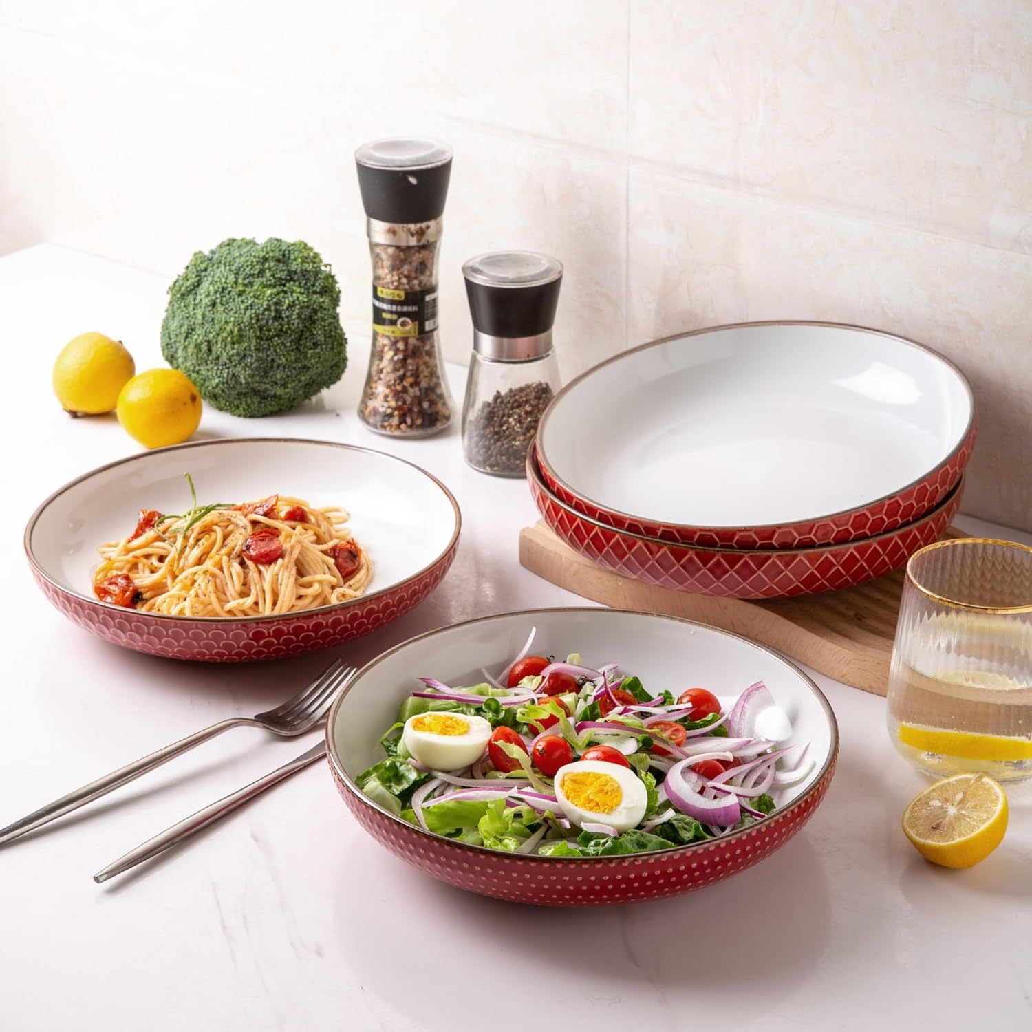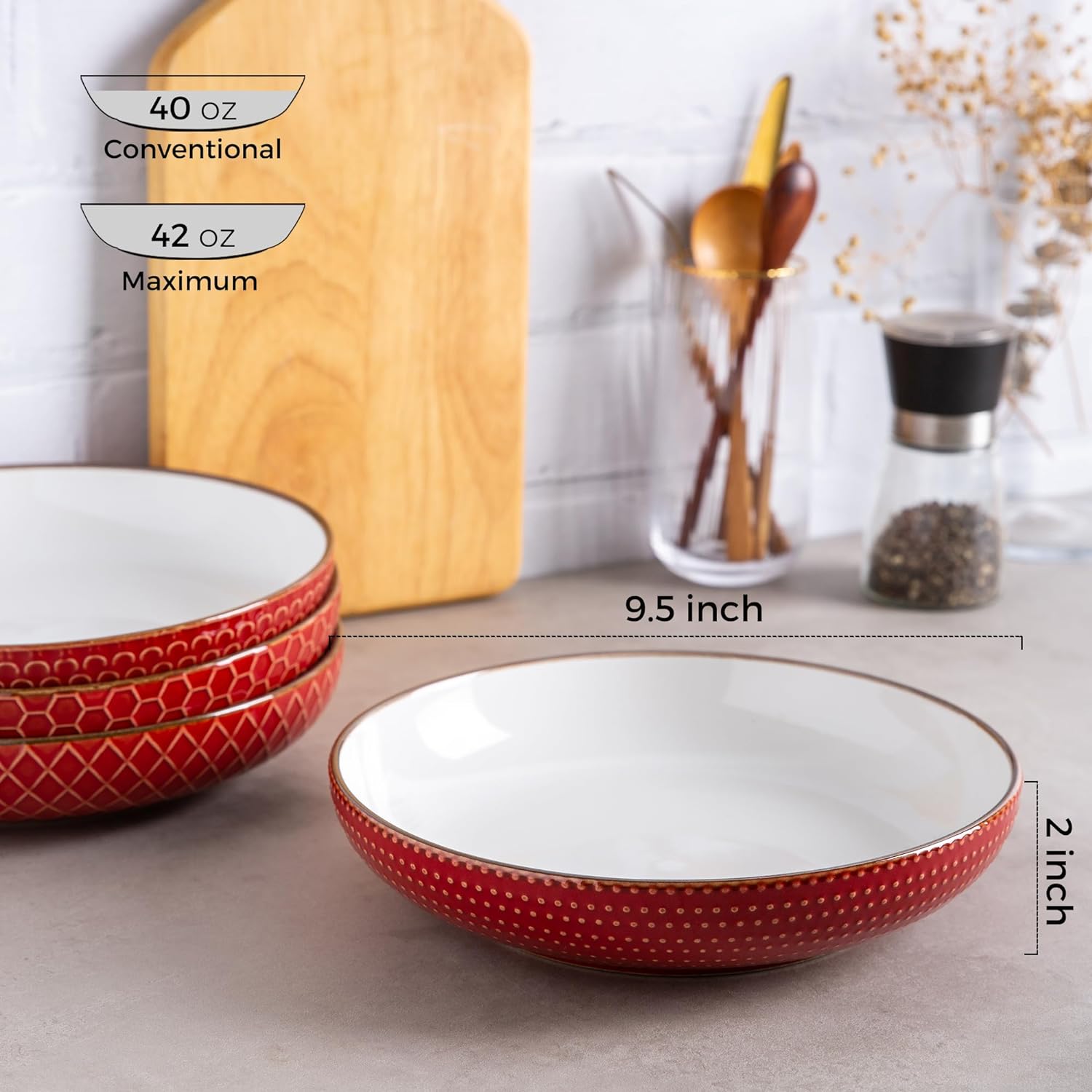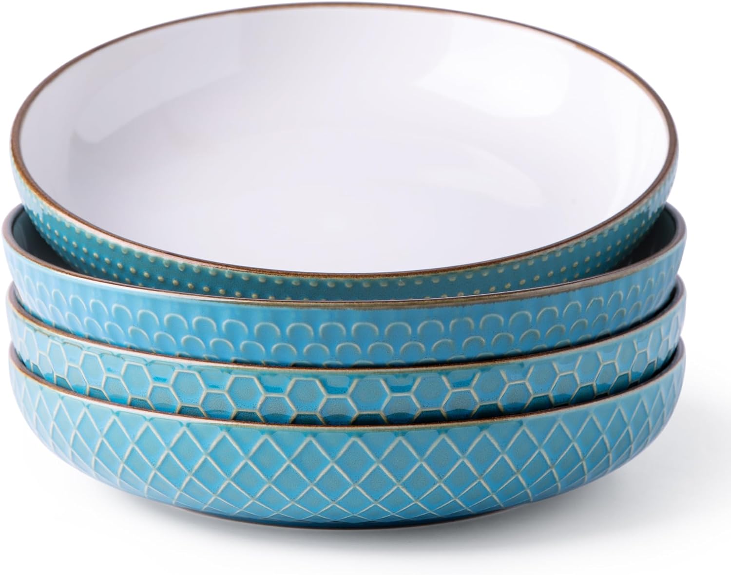 GBHOME 9.5'' Large Pasta Bowls, 42 Ounce Stoneware Salad Bowls for Kitchen, Ceramic Serving Bowls With Textured Pattern for Pasta,Fruit, Stews,Salad,Noodle, House-warming Gift,Set of 4-Off White, Cobat Blue,