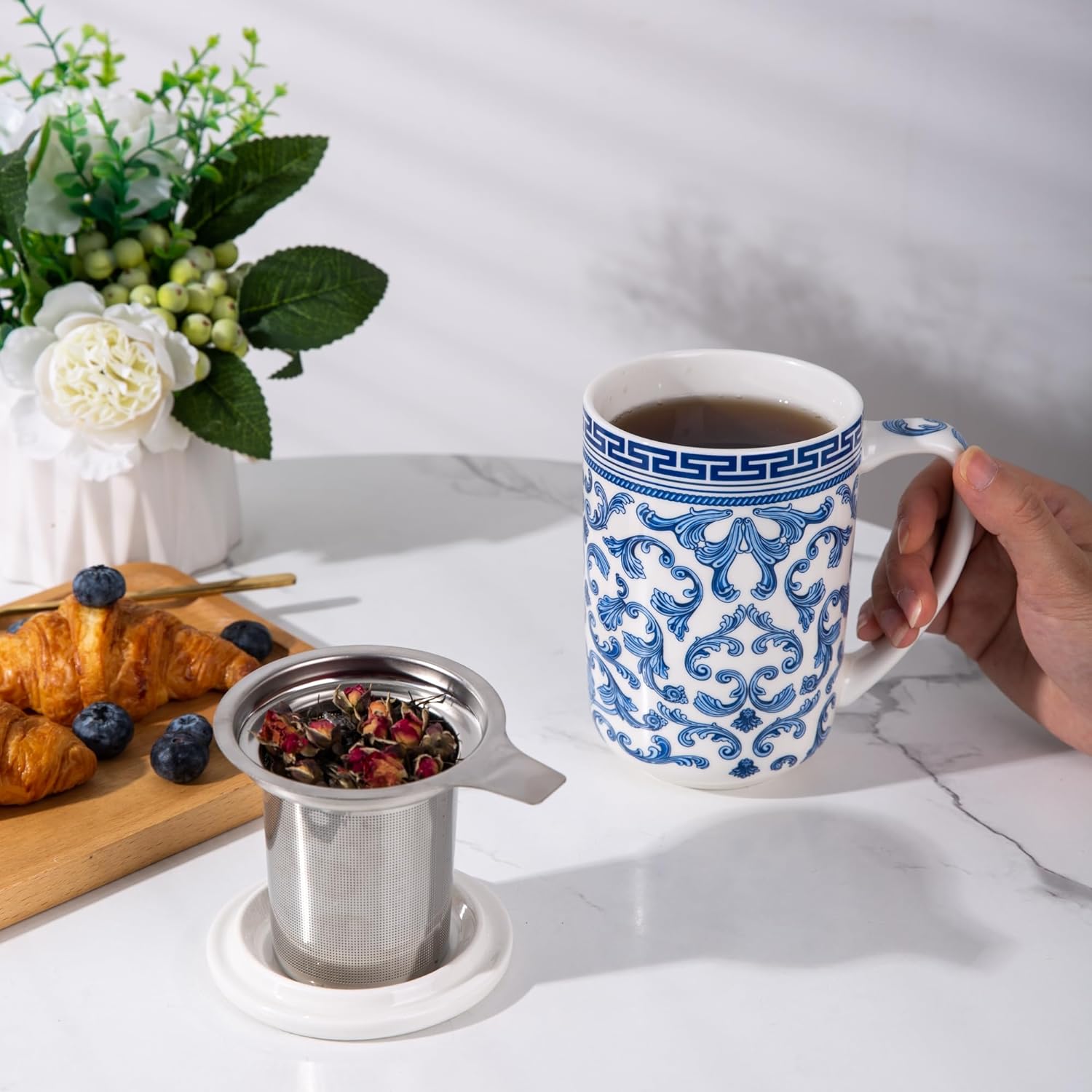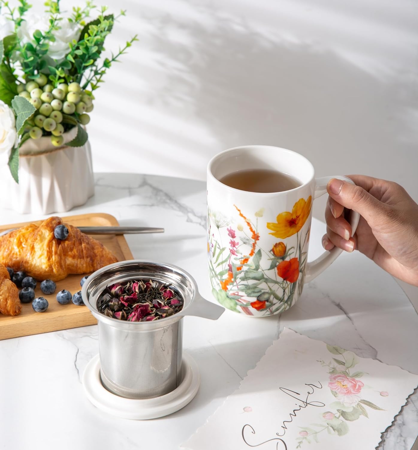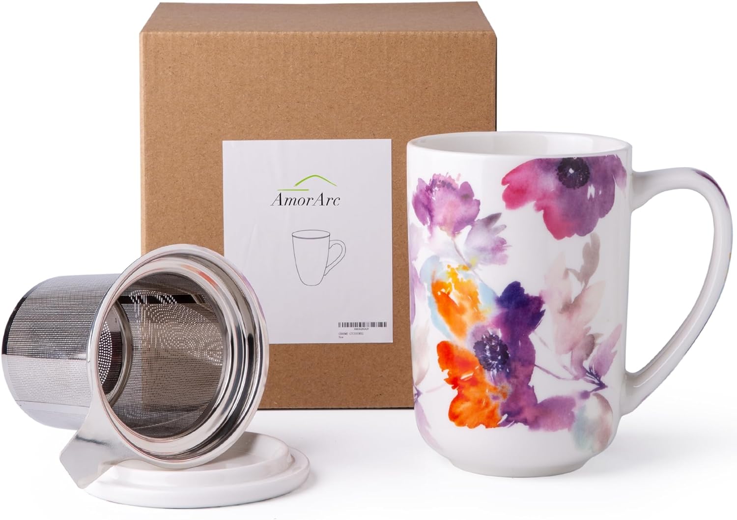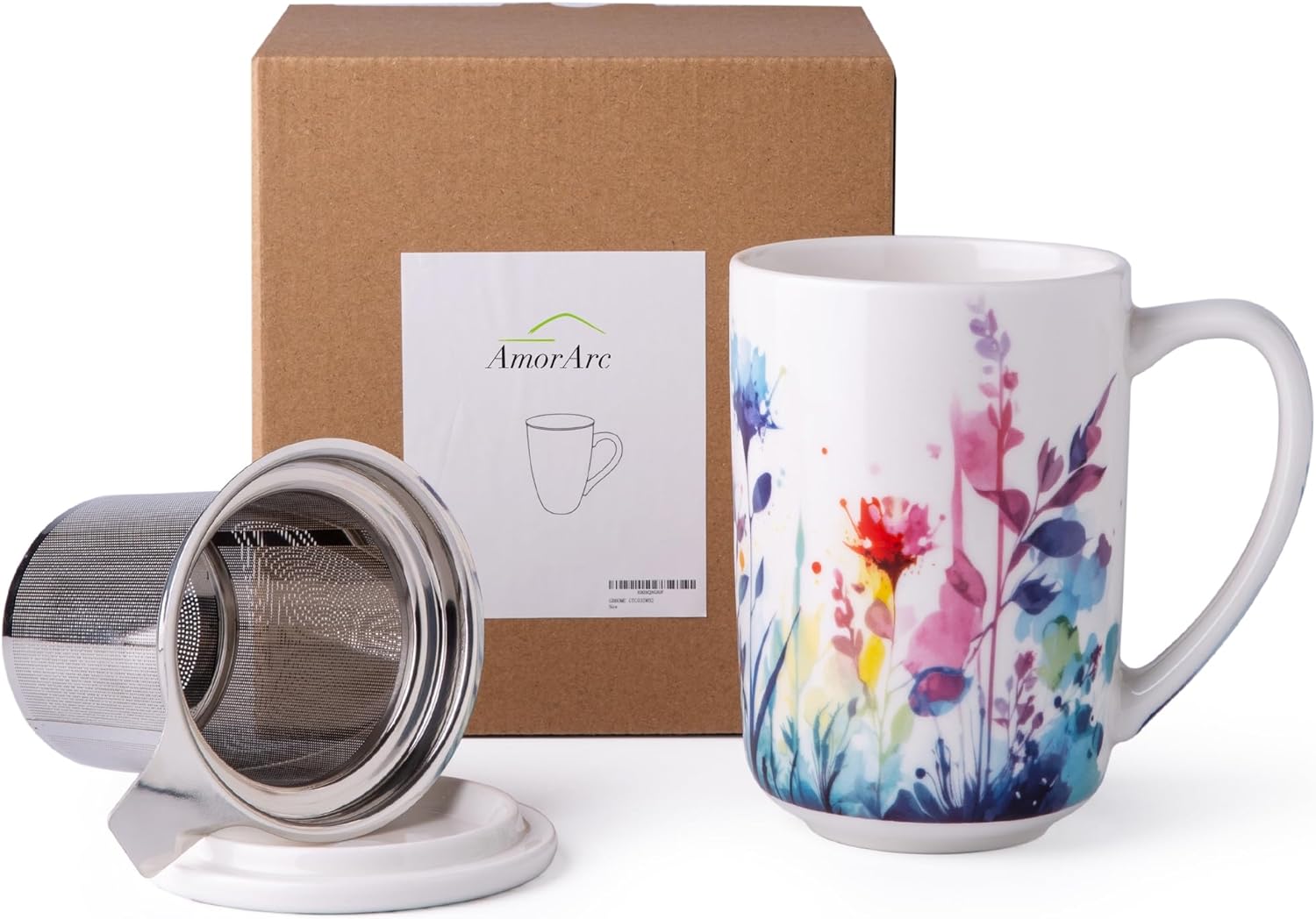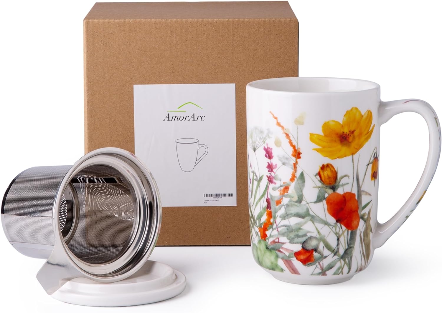 AmorArc Porcelain Tea Mug with Infuser and Lids, 18 Oz Tea Cup Strainer with Tea Bag Holder for Loose Leaf Tea, Tea Steeping Coffee Mug for House-warming Wedding Birthday Gift